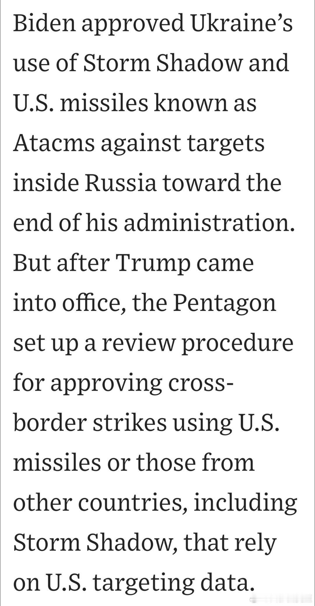 实情:Biden任期内,也没给美制Tomahawk,但批准乌军用英制Storm Shadow;Trump上任后,改为使用需国防部长批准,一直没批;最近权限转至美军驻欧洲司令部,负责人兼北约总司令,批准提供定位信息;乌军已用Storm Shadow成功炸毁俄军工厂
