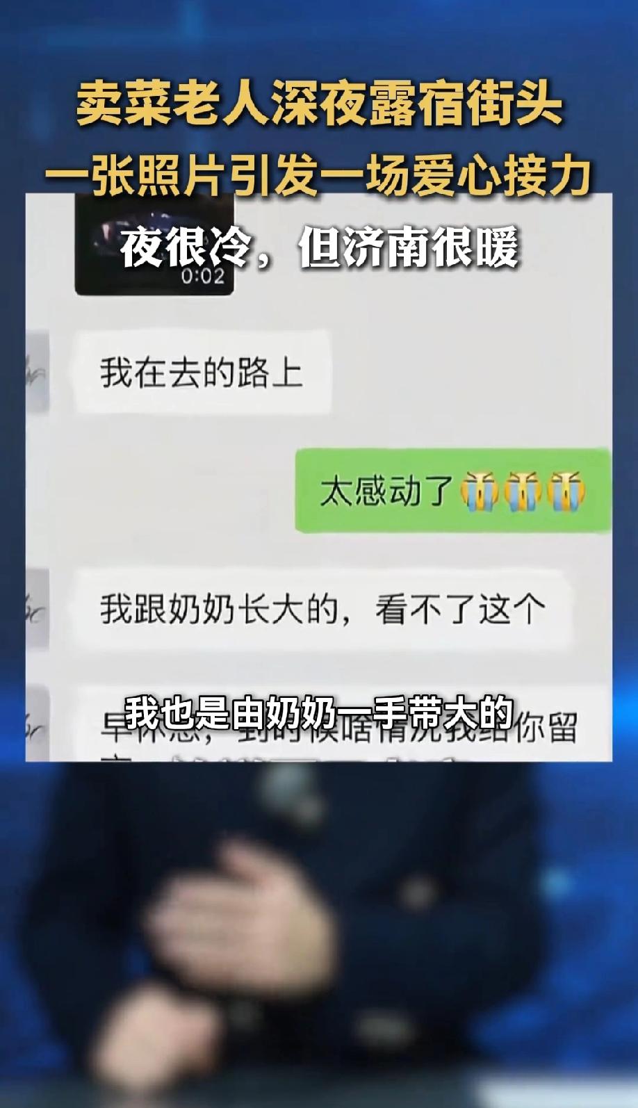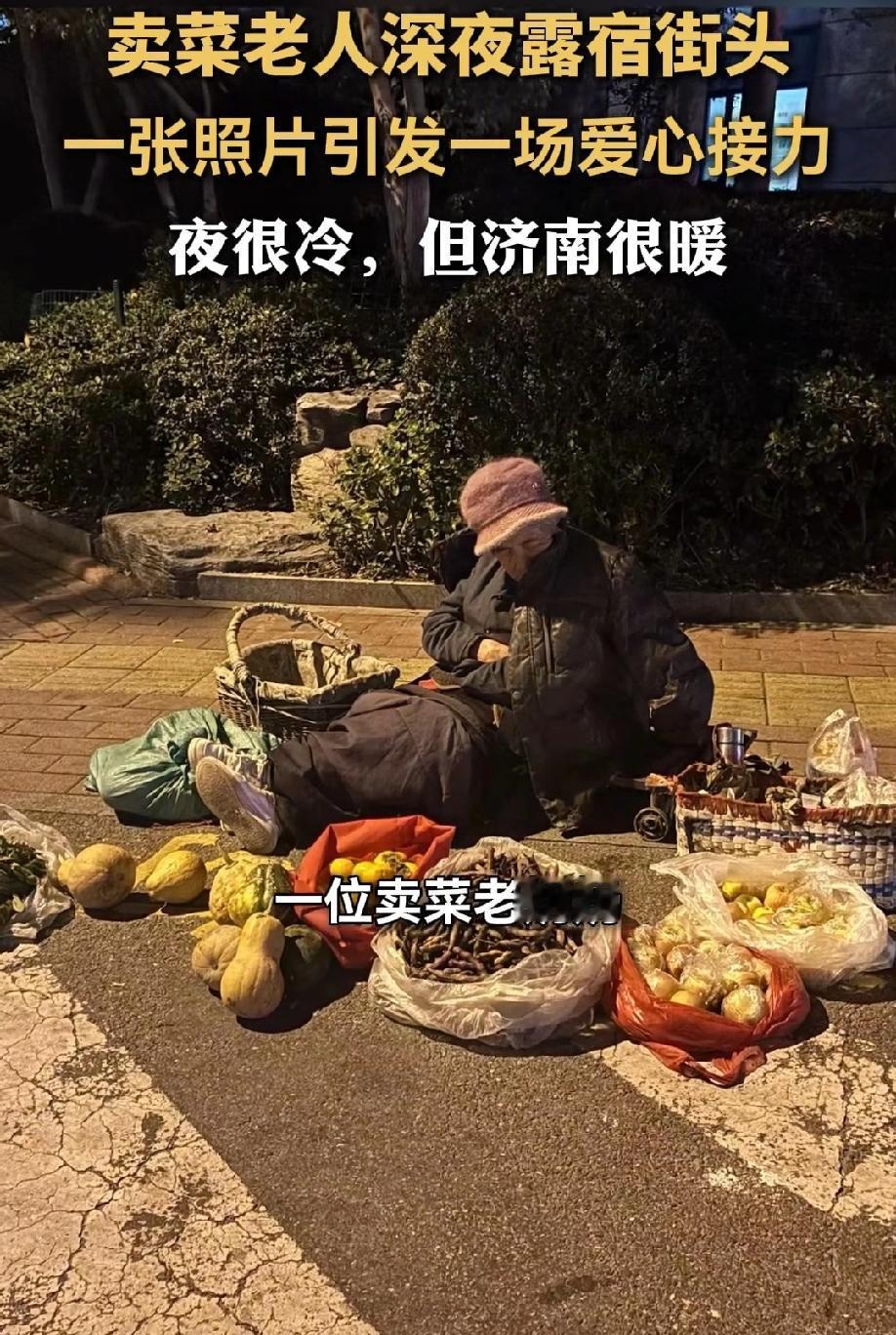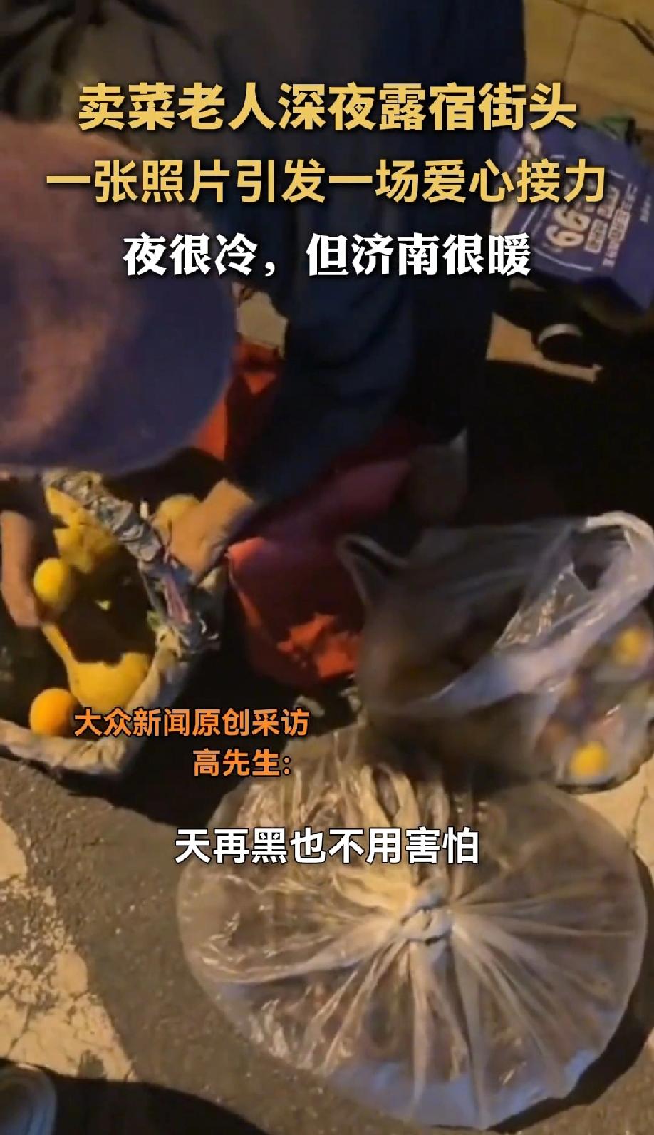 “太暖心了。”济南零下五度的街头,一位头发花白的卖菜老奶奶,独自一人蜷缩在路沿上,半张脸埋进单薄的旧外套里,身前散落着好几捆还没卖完的青菜和少量水果,身子忍不住在寒风中微微发抖。一男子路过,不经意间瞥见这一幕,十分同情这位老人,就拍了一张照片发到朋友圈,没想到引发了一场爱心接力。网友:“夜很冷,但济南很暖。” 晚上十点半左右,刚加班结束的欧阳先生骑车送妹妹回家,路过济南二环东路与窑头路交叉口时,看到了一个十分单薄的身影,这一幕让人十分揪心。 妹妹提议上前照顾生意,在交谈中,他们才得知,老奶奶家住在南部山区西营,一大早就进城来卖自己家种的菜,到了傍晚,却因为记错了末班车时间,回不去了。再加上老奶奶身上没有多余的钱,就打算在街头凑合一晚,等天亮之后再接着买菜,这样就不用来回跑了。 看到老人被冻得发红的双手,欧阳先生心里十分不是滋味,当即就拍了一张照片,发到朋友圈,想看看身边的朋友有没有能帮忙的。 没想到,这条带着温度的求助信息很快开始传递。欧阳先生的好友高先生看到后第一时间转发,朋友圈里瞬间涌来许多关切的留言:有人问清具体位置,有人支招联系救助站,欧阳先生还顺着网友的建议拨通了救助站电话,对方立刻回应随时可以接收老人。 更令人动容的是,高先生的一位客户看到朋友圈后,当即在评论区留言:“我开车过去看看,不行我给她送回去”。据了解,这位好心人从小由奶奶带大,看到照片里的老人,瞬间想起了自己的亲人。 半个小时后,这位不愿透露姓名的好心人驱车赶到路口,径直走到老奶奶身边,蹲下身跟老奶奶说:“奶奶,你就称,称完我都要了。” 老奶奶愣了半晌,嘴唇微微颤抖,一时什么话也没说出来。等称完了菜,结完来钱后,好心人又细心地问了老奶奶家住在哪里,帮老奶奶把东西搬上车,将老奶奶送回了家。一张照片、一次转发、一场接力,为这场温暖的传递画上了一个圆满的句号。 网友说:“夜很冷,但济南的人,心很暖。” 其实,生活中的温暖从来都不需要多么的惊天动地,很多时候,只是陌生人的一次举手之劳。虽然现在城市节奏很快,大家都习惯了各顾各的,但善意不分大小,我们的身边总会有不期而遇的温暖。
