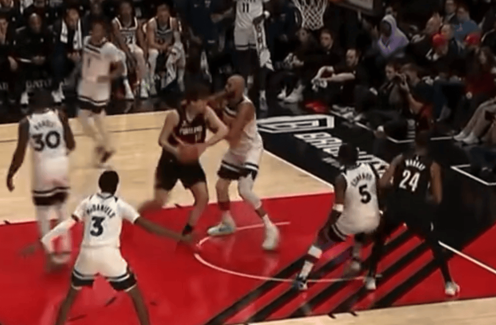 第二节比赛中,杨瀚森先遭戈贝尔大帽,随后又被麦丹隔扣。