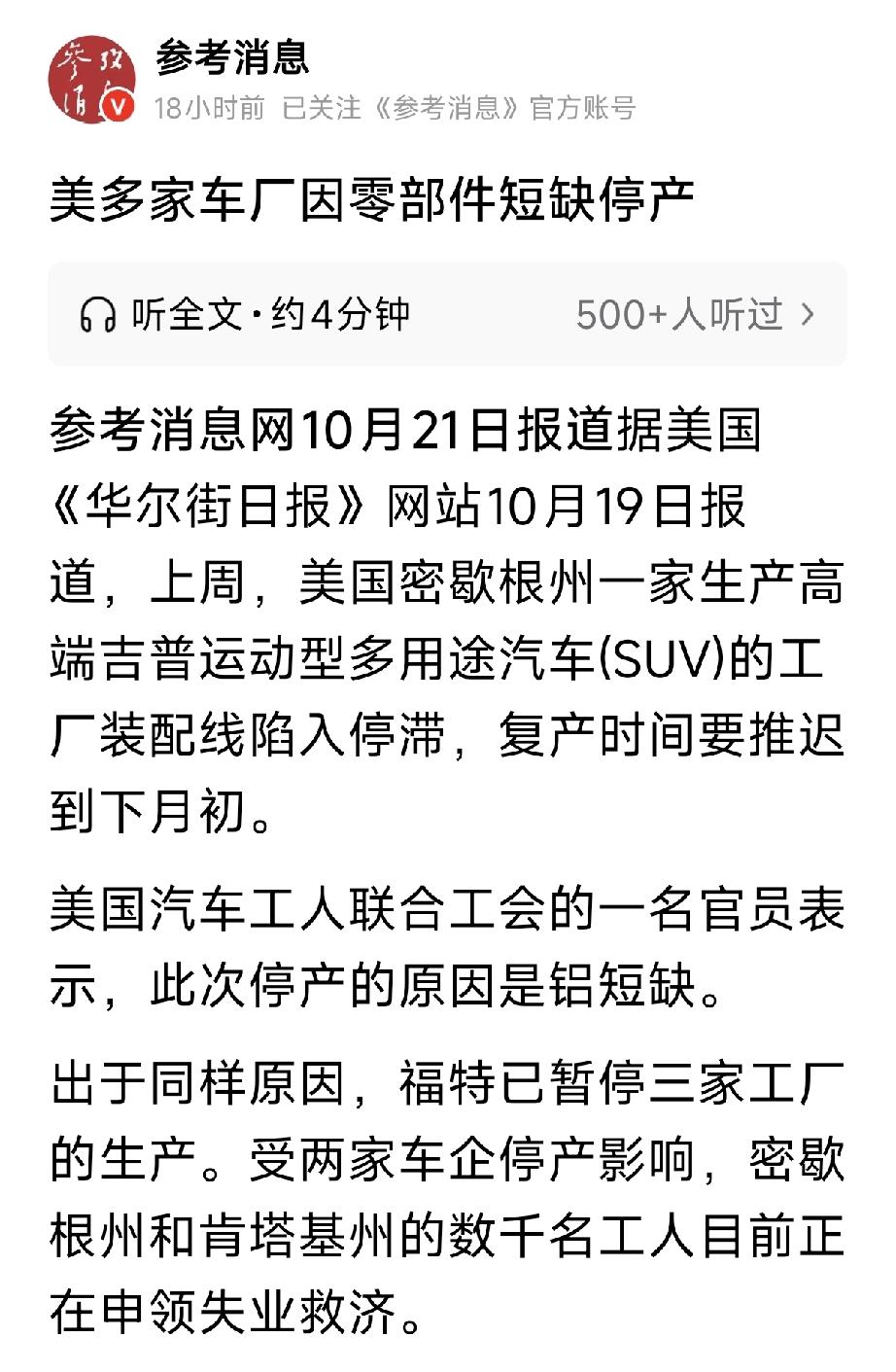 这实在说不过去啊,美国多家车企因缺铝原料而停产,可中国并未对铝实施管控,理应不存在铝材料短缺的情况。况且中国在市场中仅占一半份额,美国缺铝实在难以自圆其说。 美国多家车企因缺铝停产,这情况真让人摸不着头脑。中国又没管控铝出口,而且在市场也就占一半份额,美国缺铝实在难以解释啊。 汽车发动机制造需要的是铝合金,铝合金熔炼需要电,美国缺电不缺铝。而铝又加了关税,所以面粉太贵,加上美国车销量下滑,所以只能停产了。 因为中国没有限制,所以商人都在等政策平稳,大宗商品交易规则迫使商人趋利避害,等等呗,结果就是美国缺铝了 对此你怎么看?