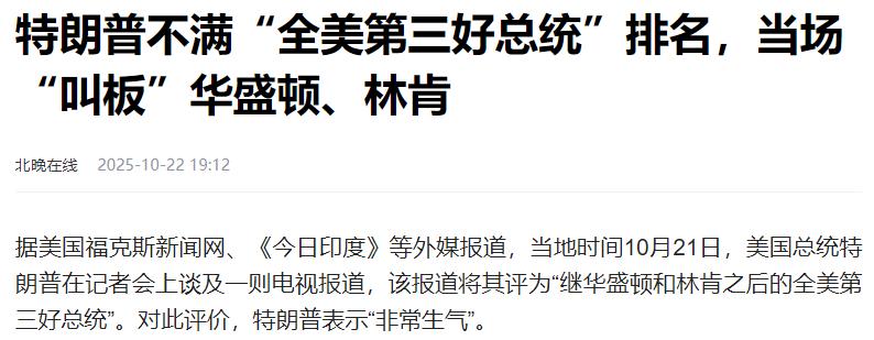 特朗普不满“全美第三好总统”排名,当场“叫板”华盛顿、林肯! 近期,有报道把特朗普评为“全美第三好总统”,仅次于华盛顿和林肯,再常人看来这个评价真不低了,但特朗普显然是不满足的。 在10月21日的记者会上,特朗普表示自己“非常生气”,还直接跟这两位历史上的总统“叫板”。他对着媒体大谈自己的“功绩”,说“他们(华盛顿和林肯)可没平息过八场战争,且第九场马上就要来了”,想用这话证明自己比先辈们更厉害。 稍微了解点美国历史的人都知道,华盛顿和林肯的地位可不是随便能比的。 华盛顿是美国的开国总统,当年带着民众打独立战争,把美国从英国手里解放出来,还定下了三权分立的制度,相当于给美国搭好了立国的架子;林肯则是在国家快分裂的时候站出来,打赢南北战争保住了美国统一,还发布了《解放黑人奴隶宣言》,推进了人权发展。 这两位的贡献是被全世界历史学家公认了的,对美国来说称得上是十分伟大的人了。 更何况,特朗普说的“平息八场冲突”,除了巴以冲突美国能控制以色列外,其他的跟美国的调停其实没多大关系。 比如埃塞俄比亚和厄立特里亚之前的和平谈判,主要是非洲联盟在中间牵头斡旋,美国只是后来发了个声明表示支持,根本没起主导作用;还有阿富汗塔利班和阿富汗政府的谈判,虽然美国也参与了,但最后因为各方意见谈不拢还是破裂了,现在阿富汗的局势依旧不稳定。 这些实打实的情况,跟特朗普说的完全对不上,也让他吹嘘的“政绩”显得站不住脚。 其实稍微琢磨一下就能明白,特朗普这次对着历史伟人“叫板”,背后藏着他对明年诺贝尔和平奖的心思。之前他就不止一次在公开场合说自己“配得上诺贝尔和平奖”,甚至还让助手专门搞公关活动为这事铺路。 说到底,历史是靠事实写出来的,华盛顿和林肯的功劳早就刻在美国的发展里了,不是特朗普几句话就能动摇的。如果他真的想在历史上留下好名声,与其纠结排名高低、夸大自己的成绩,不如踏踏实实做些对老百姓、对国际社会真正有好处的事。 毕竟,一个人的历史地位从来不是自己吹出来的,得经过时间和事实的检验,光靠嘴皮子功夫,最后只会被人当成笑谈。