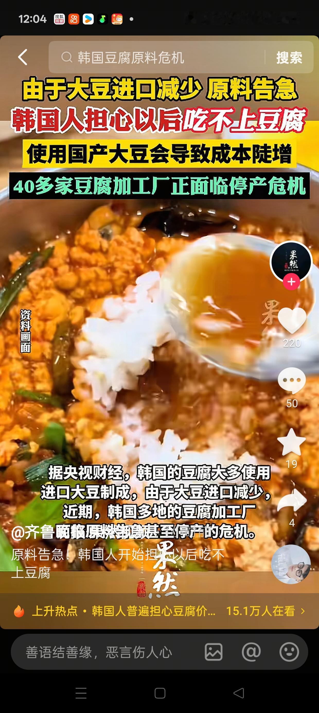 韩国吃豆腐都犯难了? 最近首尔超市里发生神奇一幕:大妈们围着豆腐货架眉头紧锁,价签像股票一样实时跳动。一块普普通通的豆腐,价格竟比上月涨了40%!开豆腐坊20年的朴老板叹气:"进口大豆价格飞涨,我的成本都快撑不住了。" 这背后也藏着惊人数据:韩国食用大豆70%依赖进口,其中大部分来自美国。随着国际大豆价格波动+韩元贬值,豆腐这个最平民的美食,正在变成"奢侈品"。 更值得深思的是,韩国粮食自给率长期不足50%,这让他们的餐桌变得格外脆弱。一块小小的豆腐,折射出的却是国家粮食安全的大课题。 记得我们小时候,豆腐永远是菜市场最亲民的食材。如今在韩国,主妇们要精打细算:是用豆腐做汤,还是改吃鸡蛋?这种"选择困难",何尝不是给我们的警示? 或许,珍惜碗中餐、守护粮食安全,从来都不是一句空话。