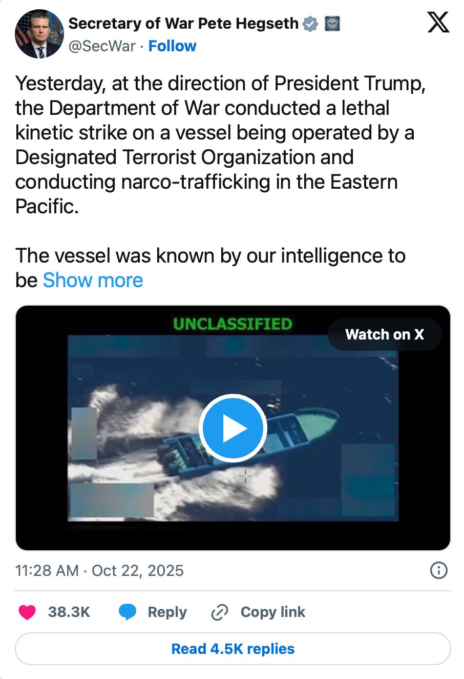 美军周二晚在南美太平洋一侧再次袭击一艘疑似运毒船只,造成船上两至三人死亡。这是自9月2日以来美方实施的第八次类似行动,前七次袭击均发生在加勒比海地区。此次行动标志着美国针对跨洋毒品走私的打击范围进一步扩大。 图片来源于网络