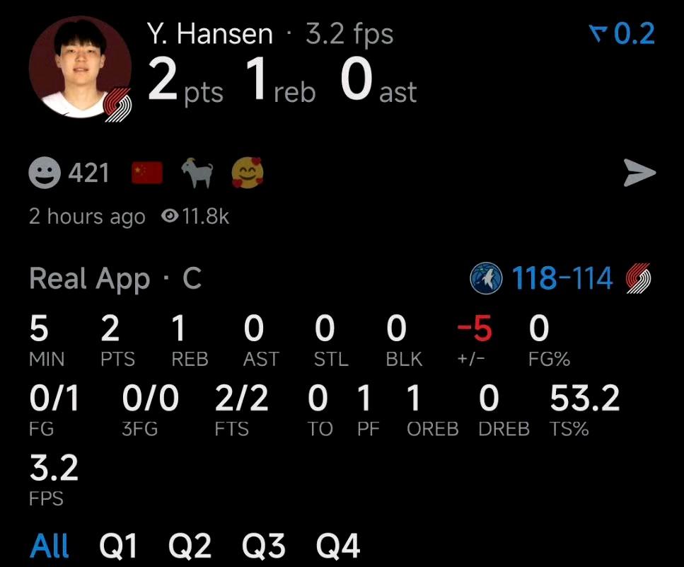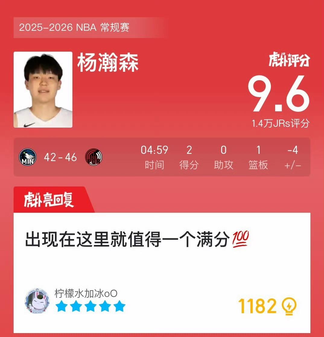杨瀚森NBA首秀,上场5分钟,1投0中,罚球2中2,得到2分1板篮板1次犯规。 第一场基本没得到表现机会,新秀需要经历一个漫长的适应过程。 网友说:出现在这里就值得一个满分、杨瀚森比隔壁状元先拿到生涯首分。