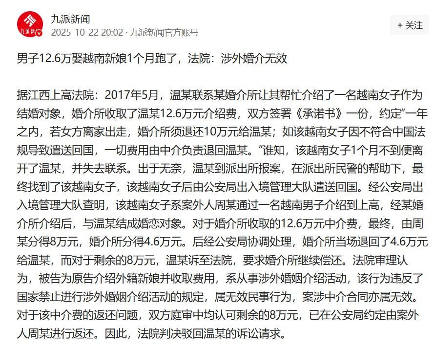 男子花12万娶越南新娘被遣送回国头号创作者激励计划表面看起来法院驳回了男子的诉讼请求,把越南新娘遣送回国,判决涉外婚介无效。但从实际效果看,男子全部拿回了4.6万婚介所要的相关介绍费,剩余的8万介绍费也让另一涉案人返还,也就是说实现了全部诉讼目的。只是另一涉案人周某不知道能不能抓到,或者说能不能最终有钱全部返还。如果能够拿回剩余的8万元,那男子在此次涉外婚姻中,基本上也没受到太大损失。