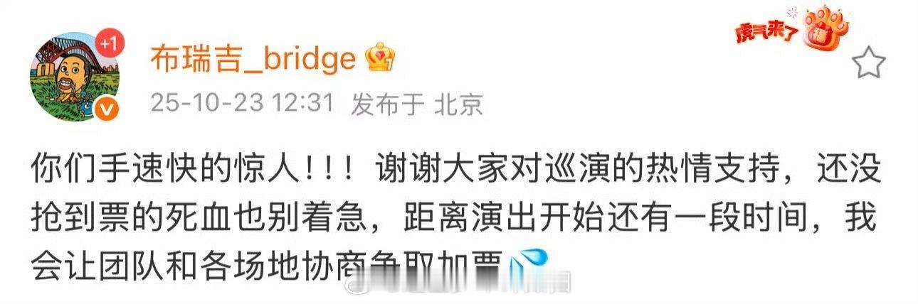 布瑞吉 你们手速快的惊人 谁来告诉我票是怎么抢的?布瑞吉巡演四站全售罄,连他本人都忍不住夸大家手速惊人!强烈请求加场,年末就想现场见桥哥,累点也没关系,别让粉丝空等啊!