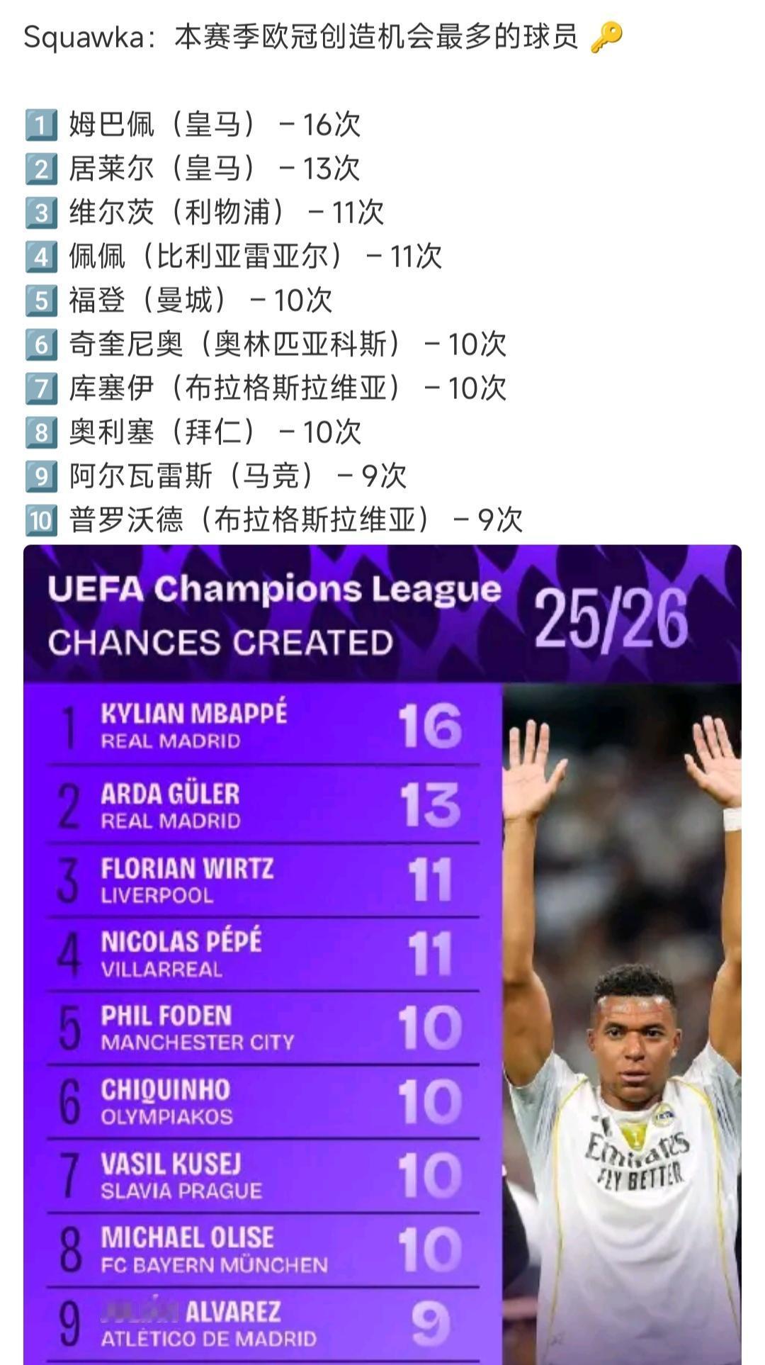 维尔茨在欧冠创造11次机会,排在所有球员第三,说明他就是高级货! 仅次于皇马帝星姆巴佩,未来超级中场居莱尔。 之前有个英超创造机会排名,维尔茨也是前三,偏偏0进球0助攻? 或许是利物浦队友不太行?? 今天利物浦球迷都在骂萨拉赫,希望埃及球王好好跟维尔茨配合,其实人家有东西的呀!![震惊]