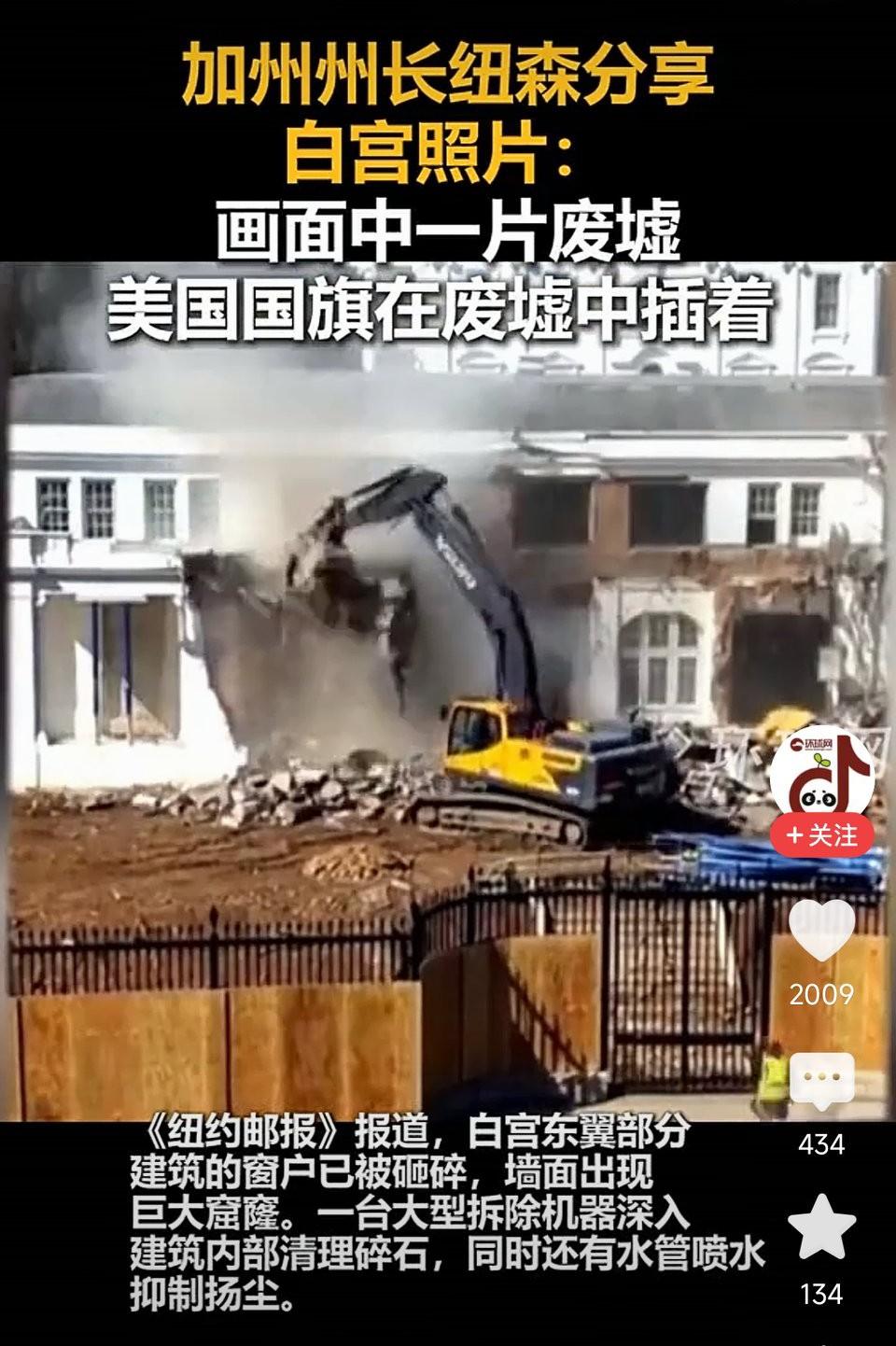 加州州长纽森分享白宫照片:画面中一片废墟,美国国旗在废墟中插着! 网友表示: 特朗普能不能用的上这个宴会厅都不一定!到时候宴会厅还没有建好,特朗普已经不在白宫了! 特朗普胆子也太小了,干脆一不做二不休,把白宫全拆了,建个特朗普宫,岂不是更好? 白宫最大的问题是难以发现和清除的各种间谍监听监视设备,川普肯定是发现自己在白宫里毫无私密和安全可言,只能全部拆掉重建了! 特朗普可以说是美国历史上最肆意妄为的总统!会不会把自由女神像也要拆了,换特朗普国王像? 老美建造太慢了,这个宴会厅据说要建造3年多,正好老特下台那年,自己都用不上,放在东大,半年给你搞完,不就一个售楼处的体量嘛,6个月都是慢的了! 政府停摆、军人发不出工资、大豆卖不出去、美丽风景线、川总统还有心拆白宫?奇闻! 这家伙特朗普把白宫当自己家了,说不定哪天头脑一发热,把国会大厦改造成养猪场。 还没等白宫改建完,特朗普就离任了。留下的烂摊子,交给下任处理了……老特这点油水也不放过! 美加州州长纽森 特朗普宴会厅