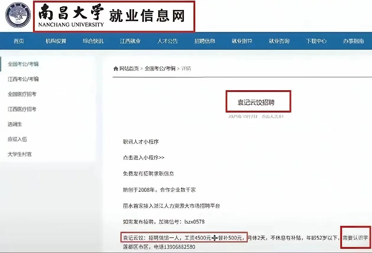 南昌大学没必要道歉,今天的大学生就业情况就是这样。 南昌大学这两天上热搜了,因为有两个企业(姑且这么说吧),带着那些画风不太好的宣传物料进了南昌大学的校招现场。 从下面的图片就能看得出来,这确实不太合适。 然后又有人在南昌大学的就业信息网上,找到了一家饺子店的招聘广告。 很多人都在感慨:像这样的企业都能经过南昌大学的审核参与校招,可见南昌大学的学生就业,不是特别乐观。 实际上今天毕业季,哪所大学的毕业生能够有非常乐观的去处? 其实这个问题不能一概而论,南昌大学固然是道歉了,但是这也不是南昌大学的错,也不是他的问题 如果有更好的企业,南昌大学看不到吗?如果南昌大学的学生足够优秀,在社会上很抢手,南昌大学用得着如此? 所以本质来讲,南昌大学也是在做一个大学最后的良心,力争为本校毕业的学生寻求更多的就业机会,哪怕这个机会不怎么好看,但终究让这些孩子们有饭吃,比他们毕业就失业情况要好得多 南昌大学这是爆出来了相关的新闻,我相信在其他大学肯定也会出现像南昌大学一样的新闻事件,只不过没有被报道出来而已 这则新闻也是给天下的大学生提了一个醒,让他们看到了一个真实的社会 虽然这职位看上去确实不怎么样,招聘主播的,招聘人事专员的,甚至招聘包饺子的工作人员,看上去和大学生确实不太搭,但是每一个职位都是大学生们了解社会的窗口,每一个职位也都是他们人生职业的起点。 南昌大学把这些招聘单位迎进校园,是给了孩子们一个选择,至于有没有人能够去这样的单位,还要看孩子们自己的选择和自己的看法。 所以从这个层面来讲,南昌大学应该无需道歉,只不过是把一个真实的社会展现在这些毕业生面前,让他们能看明白这个社会,让他们对自己的前途有真实的计划和看法看法,让他们多了一种人生的选择,仅此而已。
