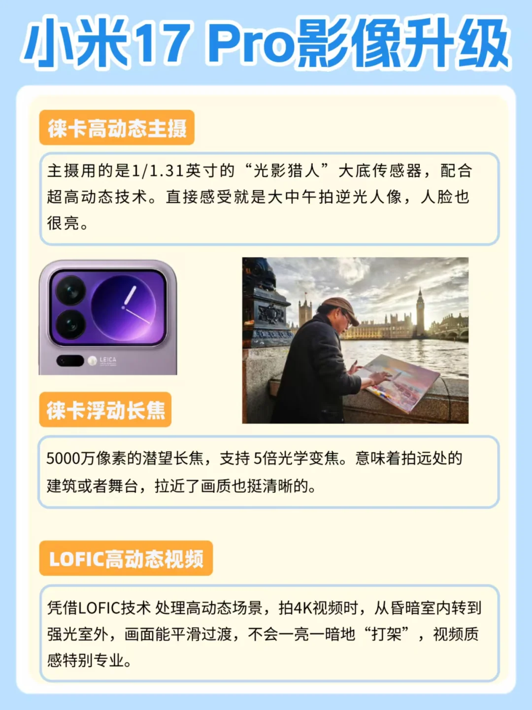 最近小屏手机市场热闹得不行,一款又一款接着发布,宝子们是不是都看得眼花缭乱了? 今天我就从影像角度出发,看一看市面上备受关注的三款小屏影像手机怎么选? 👉🏻果子17 Pro 三颗镜头全部提升至4800万像素,在不同焦段间切换时能获得一致的画质表现。 潜望式长焦最高支持8倍光学变焦,拍摄远景人像时细节更加丰富了。 它的成像风格真实自然,色彩还原准确,对于追求真实的用户来说很友好。 👉🏻小米 17 Pro 与徕卡的深度合作让它在影调上独具特色,光影层次丰富,特别适合追求艺术感的摄影爱好者。高动态主摄在逆光环境下表现出色,能很好地平衡人物与背景的光比。浮动长焦支持5倍光学变焦,无论是远景还是特写都能胜任。 👉🏻vivo X300 vivo X300是X200 Pro mini的升级版,在保持轻巧手感的同时,深得Pro级影像旗舰的精髓。 它的2亿像素主摄拍摄时不用过分纠结取景范围,事后裁剪依然能保留丰富细节。 行业首发的AI定制美颜,能智能优化肤色与质感,呈现出更自然生动的状态。还有录中美拍、全焦段变焦闪光灯、闪光烟花人像等,人像拍照的功能是真的丰富。搭配增距镜,可以直接变成演唱会拍照神器,拍爱豆高清美照也是轻轻松松的事情。 ✅总结建议 ➡️三款小屏旗舰都很香,选哪款都ok。如果对于影像方面特别有追求的话,我会更推荐大家选择vivo X300,它的整体影像方面的实力堪称是专业级别,有很丰富的创作空间。而且价格也才4399起,跟其他两款旗舰机相比价格是真的很香!