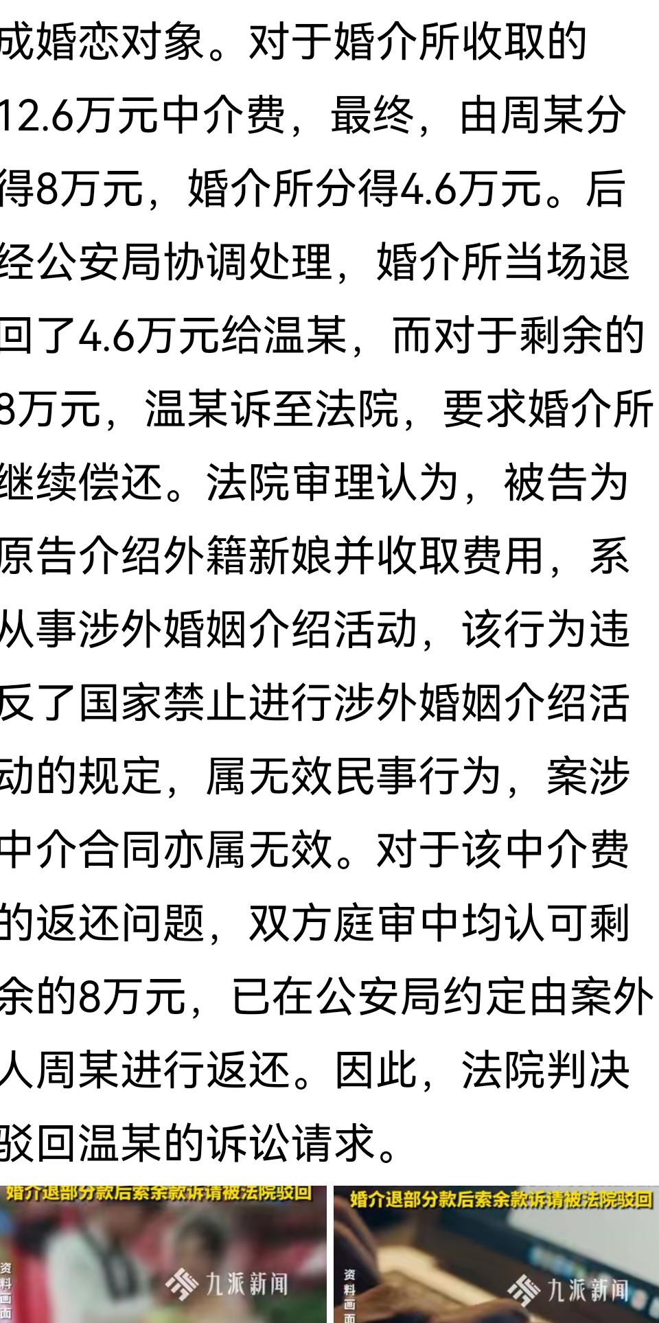 涉外婚姻需谨慎,否则,鸡飞蛋打人财两空! 据报道,江西一个男子,花了十二万多块钱,通过婚姻介绍所娶了一个越南姑娘。仅过了一个月,姑娘就跑了。 虽然婚姻介绍所曾承诺如果媳妇跑了会给予赔偿,但因涉外婚介行为违反我国相关规定属无效民事行为,故婚介所的承诺也是无效的,男子的损失不受法律保护。 挣钱不容易,婚姻更不是儿戏,一定要小心守法,否则人财两空空悲切!