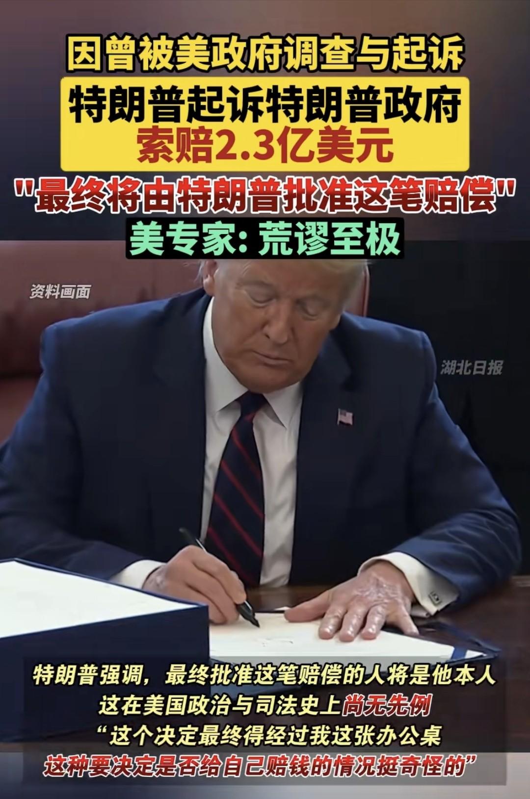 自己审批给自己赔偿? 特朗普向美国政府索取2.3亿美元赔偿:“我受到了很大伤害”! 其实,特朗普早已不是那个政坛新人了。 他的前后两任总统经历,大家都耳熟能详。 可让他彻底“变脸”的,是那些年被调查、被起诉的风风雨雨。 第一任期时,特朗普遭遇的“通俄门”“通乌门”调查,弹劾、听证、检方传唤,几乎没消停过。哪怕卸任后,也没能彻底轻松。 那段时间,特朗普一度成了美国司法和媒体的“常客”,各种指控、调查、起诉接连不断。 就算是铁杆支持者,也没想到美国历史上会有一位总统被“追着查”查到这个地步。 近日,他一纸诉状,把美国联邦政府告上了法庭,理由很直接:过去针对他的调查和起诉,造成了他巨大的经济和名誉损失。 他开口就要2.3亿美元赔偿。这一下,美国政坛哗然。 毕竟,这可是现任总统起诉前总统时期的美国政府,说白了,特朗普这是和“国家机器”掰手腕。 有人说他是“以牙还牙”,有人说他是“以身试法”,但特朗普自己倒是很清楚,他要的不只是钱,更是一个态度。 整个诉讼过程公开透明,特朗普在媒体前毫不避讳。 他多次强调,自己当年被调查、起诉,没有任何实锤证据,纯粹是政治斗争的产物。 他甚至把这场诉讼当作“反击民主党”的一部分。 特朗普团队的说法很直接:你们曾经耗费大量国家资源查我、告我,结果啥也查不出来,现在总得有人负责吧? 2.3亿美元的金额看似夸张,但特朗普的算盘很清楚——这不仅能为自己“正名”,更能让支持者看到他的强势。 特朗普这次的举动,让美国的党争更加激烈。 支持者觉得他勇敢、硬气,反对者则批评他把个人恩怨带进国家治理。 可无论如何,这场“总统告政府”的戏码,的确让全世界都看得目瞪口呆。 在特朗普看来,这2.3亿美元不仅仅是钱,更是对美国体制的一次“灵魂拷问”。 被调查、被起诉的那些年,他忍着、扛着,现在终于有了机会反击,他不会放过。 回头看特朗普这几年,第一任期时,他还有点“想做点事”的热情,结果被调查、弹劾、党争拖得身心俱疲。 第二次上台,他变得更务实、更强硬,抓住机会就“反击”,把所有精力都用在打击对手和搞经济上。 这场索赔案,更像是他“斗争哲学”的最新演绎。 说到底,特朗普性格里那种不服输、敢碰硬的劲儿,既让他成了美国政坛的异类,也让美国社会在他身上看到了体制与个人的极端冲突。 这场2.3亿美元的诉讼,不管最终结果如何,已经成为美国历史上一个难以绕开的节点。 它让人们重新思考“权力边界”“体制公正”这些大问题。 特朗普用自己的方式,为美国政治留下了浓墨重彩的一笔。 对普通人来说,或许这也是一次提醒——面对体制,个人既要守规则,也要敢于争取公正。 特朗普的故事,远没到落幕的时候,美国的社会争议也还会持续下去。 但有一点可以确定:他把“斗争”这个词,写进了美国政治的现实里。 参考:2.3亿美元!特朗普向特朗普政府索赔——鲁中晨报