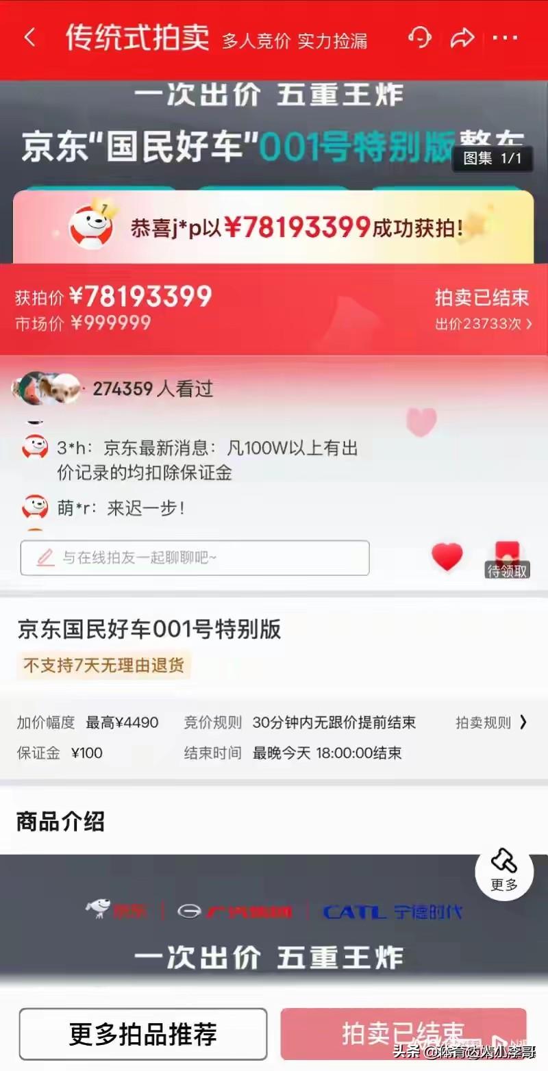看来东哥还是非常有公信力的,也是非常有魅力的一个人,京东的第1号汽车被叫出来之后就被飞速被别人买了,而且这辆车的话还是被高价拍下7800万,我们都不可思议,这背后的神秘推手是谁?难道是京东内部的高管吗?还是跟刘强东关系比较好的人?这都很难说,因为001号是最具有特别纪念意义的一款车,所以说大家对于京东的这款车还是寄予期待,它就像当年的雷军一样,大家觉得小米手机比较好用,所以说情愫也自然转移到小米汽车上面,但是现在小米汽车事故频出,小米的营销也陷入了滑铁卢,因此的话,大家转眼对国民造车的信心转移到东哥上面,不知道东哥会不会让大家失望,一切都很难说,让我们期待京东造出更好的车来!