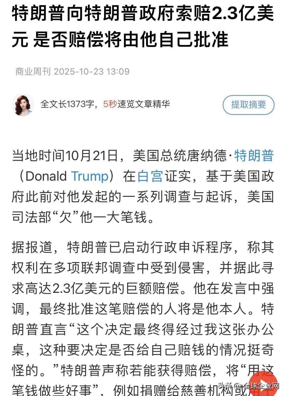 特朗普向特朗普政府索赔2.3亿美元,是否赔偿将由他自己批准。 还得是川普会玩…