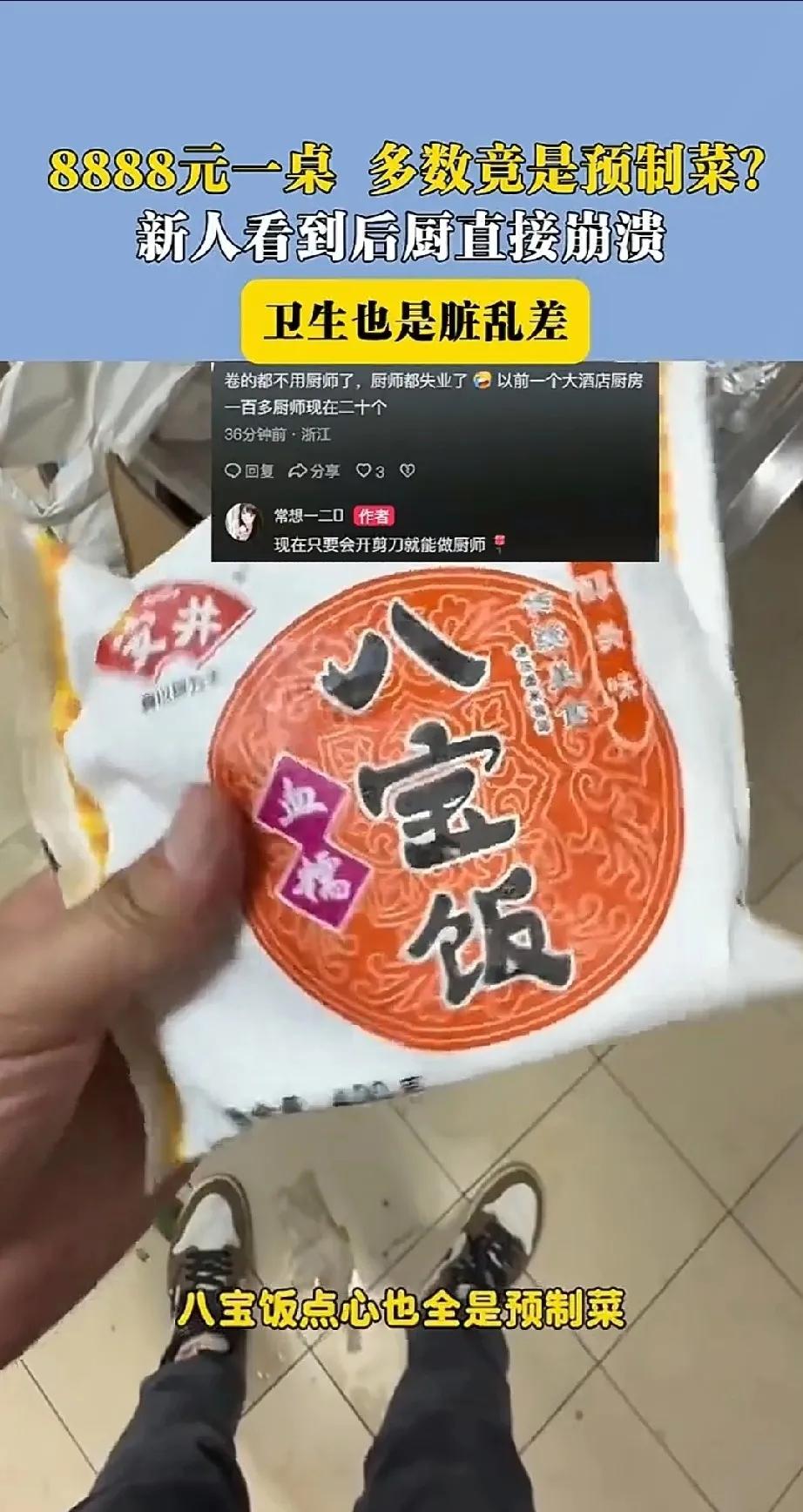 上海万豪酒店38万婚宴翻车!8888元一桌吃预制菜,酒店回应更是让人气愤 花38万办婚宴,换来的全是吐槽? 近日有博主爆料,在上海中优城市万豪酒店举办婚礼,8888元一桌的菜品质堪忧: 新鲜虾变冷冻虾 白切鸡带着血水 海鲜贝壳只见壳不见肉 更扎心的是,后厨堆满预制菜包装,与酒店“100%无预制菜”的承诺完全不符! 事件发酵后,酒店竟给博主发律师函,要求删帖道歉。 网友炸锅:“这价格在乡下能办三场!”“自己买菜请厨师不香吗?” 城乡结合部自办酒席突然真香 食材亲自采买,鱼虾肉蛋全新鲜 厨师现场烹饪,吃得明明白白 价格实在,性价比超高 何必花冤枉钱,买一顿“高端预制菜”? 高端酒店不该用预制菜糊弄消费者,被揭穿后还威胁起诉,简直刷新三观!支持博主维权,必须给个说法!