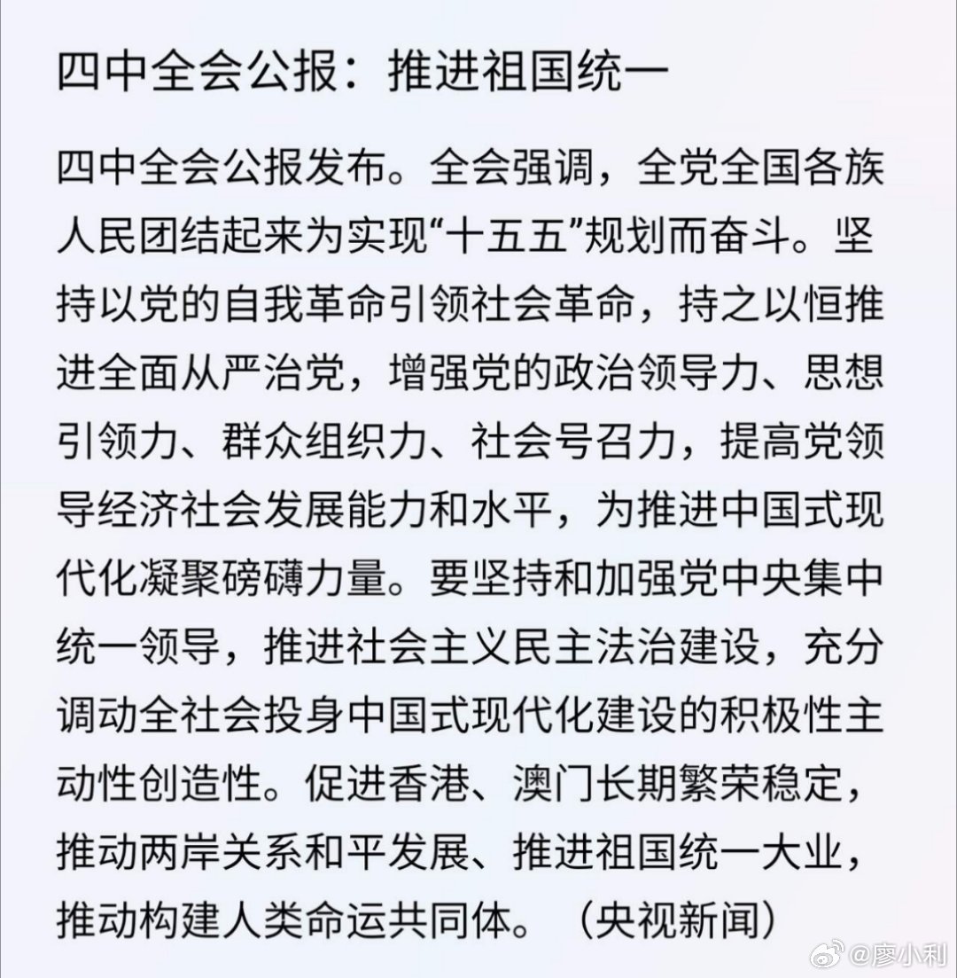 介绍和解读四中全会精神这次四中全会公报除了“十五五”规划外,更吸引人注目的就是推动两岸关系和平发展,推进祖国统一大业!与十九届四中全会的说法“坚定推进祖国和平统一进程”明显不同是,这次在统一的前面,去掉了“和平”两个字,而是把和平说成“推动两岸关系和平发展”,然后推进祖国统一大业!种种迹象表明,统一已经提上日程了,很可能会在“十五五”完成祖国统一大业!热点观点