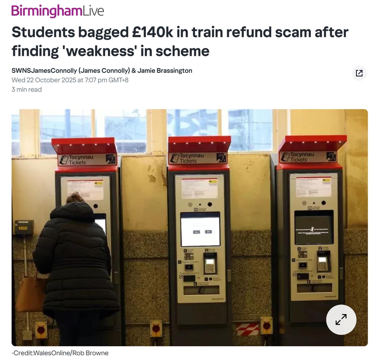 两名中国留学生利用火车购票漏洞,诈骗英国铁路14万英镑。这两名中国留学生一个叫LI LIU,另一个叫WANGQING YU。在2021年他们偶然发现英国火车延误可以赔偿,于是就疯狂购买各地的火车票,退票后再申请赔偿。先后用16个身份,20个电话,来实施退票延误赔偿,直到2024年被一个铁路公司发现被抓,他们已经非法所得14万英镑。最终被法庭一个判决30个月,一个17个月,因为悔罪,想家,法庭判决后把他们释放了。