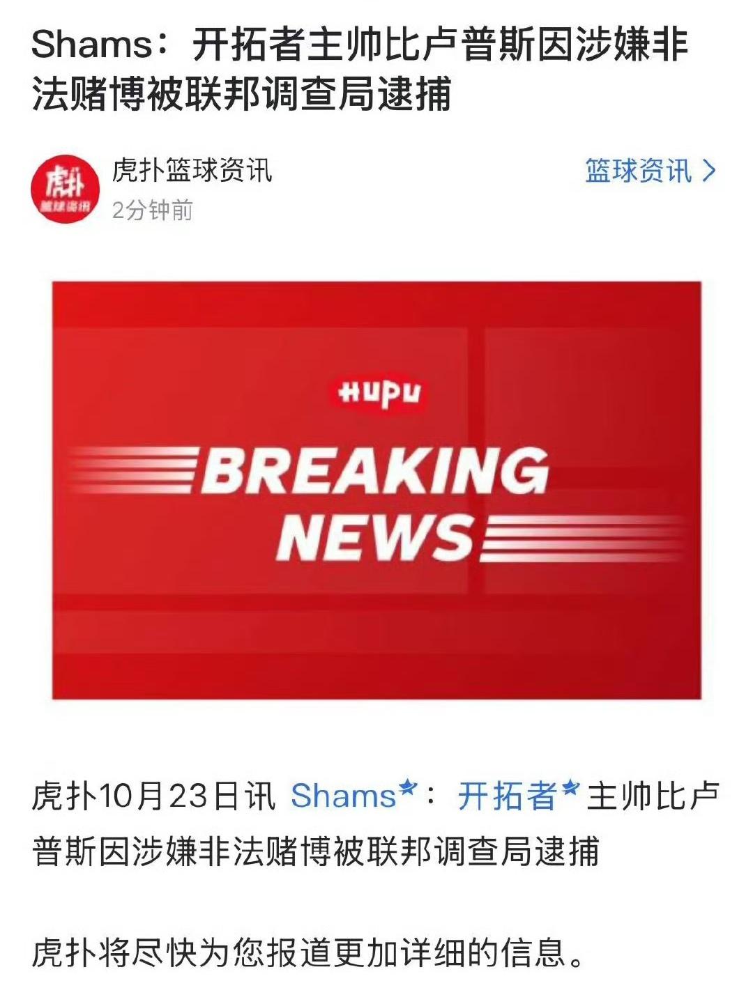 大晚上看到比卢普斯涉嫌非法赌博,被美国FBI逮捕了。 他可是开拓者队教练,是杨瀚森的教练啊! 这下不知道杨瀚森的命运会如何。 更不知道比卢普斯是赌博,还是赌球?? 最后很多老球迷都认识他,2004年活塞总冠军,FMVP呀,真不敢相信, 这下开拓者要换帅了。[震惊]