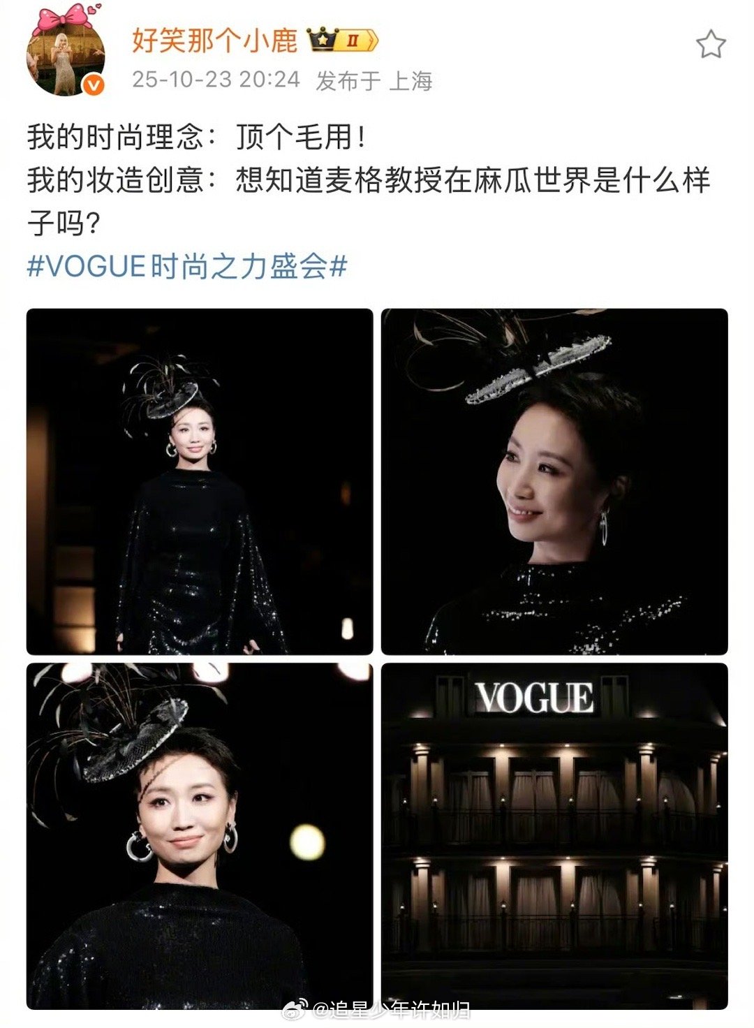 小鹿VOGUE妆造顶个毛用 小鹿这波红毯操作满分!自带梗的“顶个毛用”妆造,黑色亮片搭配羽毛头饰,又闪又有记忆点,时尚感拉满!