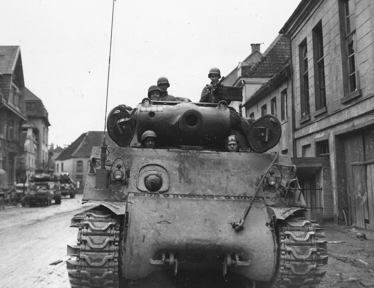 比较少见的型号——1945年3月6日,德国,莱茵贝格市。美国第35步兵师第654坦克歼击营的一辆M36B1型90毫米自行火炮正在执勤。 M36B1型90毫米自行火炮(M36B1 90mm GMC,参见图2)是美军在二战后期开发的坦克歼击车,采用M4A3“谢尔曼”坦克底盘与开放式炮塔组合,主武器为90毫米M3火炮,是少数直接使用中型坦克底盘的过渡型号。 “第35步兵师”,绰号“圣塔菲”。以铁路徽章为臂章标志,在欧洲战场参与过诺曼底、阿登等重大战役。