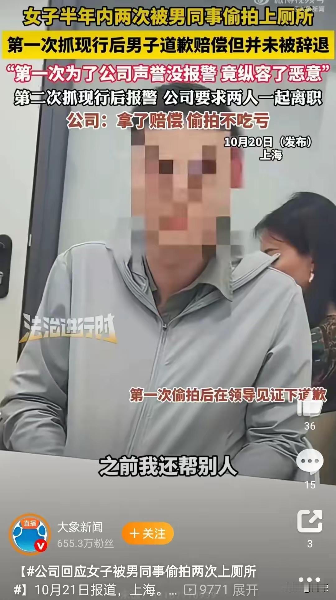 公司有个变态狂专门厕所偷拍! 公司操作比渣男更恶心, 这样的公司估计很快就倒闭 色胆包天的男子两次在公司厕所偷拍女同事,第一次次被抓后经领导劝说,受害者为顾全公司声誉选择和解。 结果这男的没有收敛反而更嚣张了,忍无可忍的女子报警后,男子仅被拘7天。 更离谱的是涉事公司,不惩处施暴者反而要求受害者一同离职,还振振有词说“你都拿到赔偿了,也不吃亏”。 这老板何德何能开公司呢?如此品行纵容恶行、寒害受害者的操作,简直是职场耻辱,毫无公正可言!