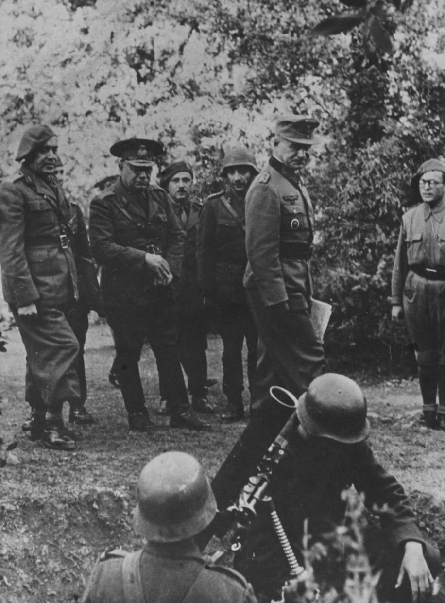 仆从军的法国炮——1944年2月,克里米亚,德军第49山地军军长鲁道夫·康拉德将军在罗马尼亚第7山地军军长乌戈·施瓦布将军的陪同下检阅部队,画面近处是一个法制81.4毫米“勃兰特”1927/31型迫击炮的炮组。 当时,施瓦布率领的罗马尼亚第7山地军与康拉德的第49山地军正共同防守克里米亚半岛。施瓦布将军在1944年8月阵亡于雅西-基什尼奥夫战役,而康拉德将军则幸存至战后,1964年去世。 勃兰特1927/31型迫击炮(参见图2)是法国设计的中型迫击炮,口径81.4毫米,被多国军队采用并仿制,是二战时期最著名的连级支援武器之一。