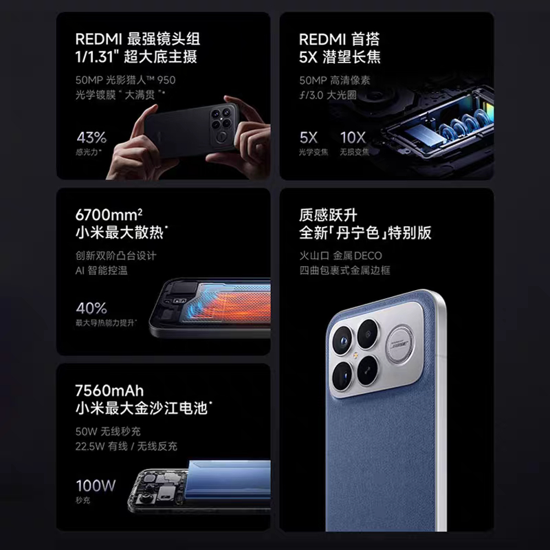 5.其他:小米HyperOS 3,小米星辰通信,超声波指纹,超线性立体双扬、红外、NFC、X轴线性马达,2.1立体声扬声系统,流金白、黑色、丹宁色,12+256GB 3999元起!