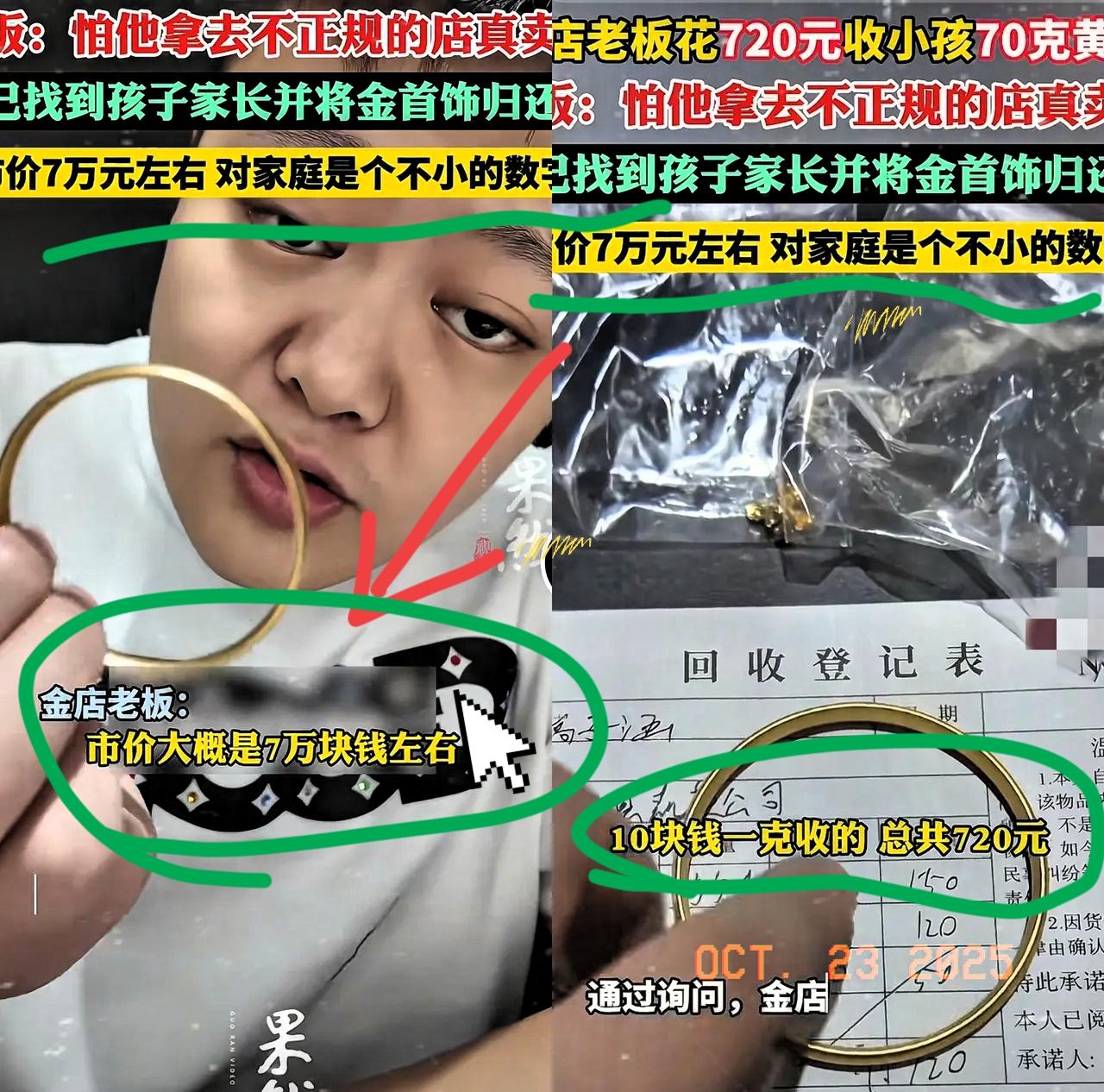 720块收70克黄金? 四川老板这波操作,比黄金还值钱! 谁能想到,四川雅安一家金店最近火了,不是因为卖了多少金条,而是老板做了件“反着来”的事! 有个小孩拿着70克黄金来卖,按现在金价算至少值7万,可老板只给了720块,转头就联系上孩子家长把首饰还了回去! 别觉得老板傻,这才是真聪明!他一眼就看出不对劲!这么小的孩子哪来这么多黄金?十有八九是从家里偷拿的! 要是他贪了这笔钱,不仅毁了一个孩子,可能还会让一个普通家庭直接损失半年甚至一年的收入! 更关键的是,要是孩子把黄金拿到其他黑心店铺,说不定连720块都拿不到,还会被教唆着继续偷,那后果才真严重! 现在很多人说“无利不起早”,可这位老板用行动证明,做生意不光看利润,更要看良心! 有些东西比黄金贵多了,比如守住底线的责任心,还有保护一个家庭的善意! 你们说,要是换成其他店铺,会不会也这么做?如果是你遇到这种情况,第一反应会是什么?一起来聊聊~