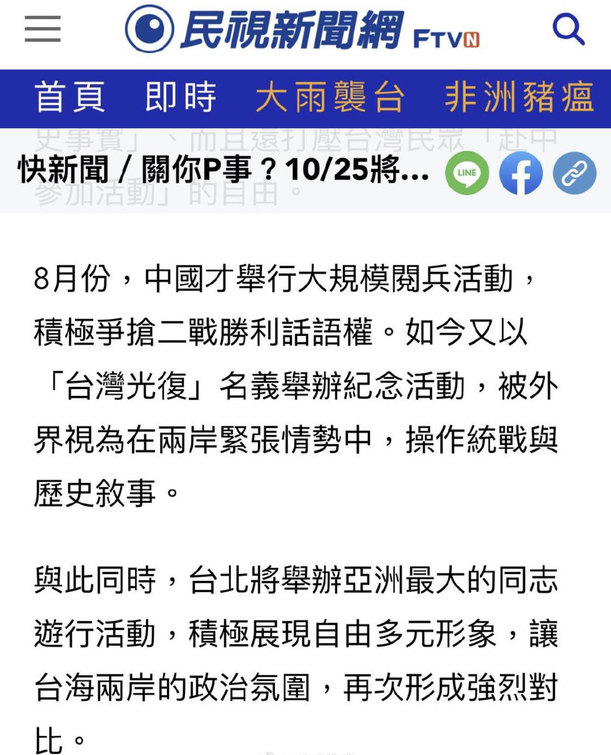 台媒:中国大陆才举行大规模阅兵活动,如今又以“台湾光复”名义举办纪念活动,这是在操作统战与历史叙事。 而与此同时,台北将举办亚洲最大的同性活动,积极展现自由多元形象,让台海两岸的政治氛围,再次形成强烈对比。