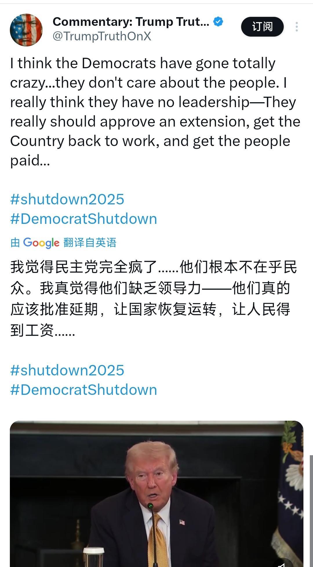 特朗普今天(北京时间10月24日)表示:“我觉得民主党完全疯了.…他们根本不在乎民众。我真觉得他们缺乏领导力——他们真的应该批准延期,让国家恢复运转,让人民得到工资......” [机智]评几句:此轮美国“政府关门”已经持续了24天,成为美国历史上第二长的政府停摆纪录。之前的记录还是由特朗普保持,在特朗普第一任期时,由于“边境墙”预算危机导致的美国“政府关门”持续了35天,这个记录12天后会被打破吗?