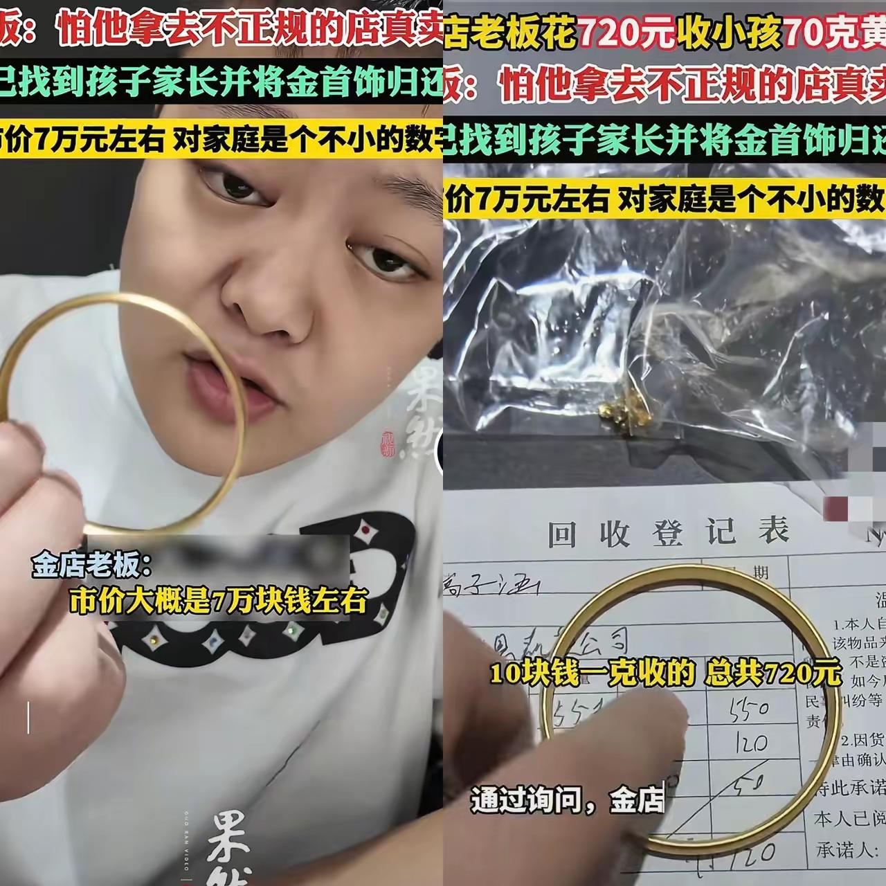 这个金店老板出名了! 四川雅安一小孩去金店卖首饰,金店老板以720元回收70克黄金,随后联 系孩子的家长,并将黄金首饰归还,老板称现在黄金价格高,觉得这个小孩的黄金很有可能是从家里偷出来的,如果自己不这么做,万一小孩拿去别的金店,被有坏心的人蒙骗了就不好了。 有网友说:假设这不是段子。那这老板就不是良心发现了。是他知道这事若被孩子的家长发现,完全可以告他涉嫌构成诈骗,一旦罪名成立,按目前的金价,至少是三年有期徒刑。他拍视频,你们以为他是告诉别人他良心发现?他只是把证据传到互联网上,证明他归还财物,对方家长想告他也没门。 金店老板品德高尚,避免了一个家庭的财产流失。这样的诚信与担当,正是社会需要的正能量!为老板点赞! 君子爱财 取之有道,为老板点赞,这才是生意该有的样子!赚钱不忘本心,把道义放在利益前面,这样的老板不仅能赢得顾客的信任,更能传递社会正能量,希望这样的良心商家越来越多 黄金有价,良心无价!老板这波操作,不仅救了一个孩子的糊涂,更暖了无数人的心,祝他生意兴隆! 老板这波操作太暖了!放着大利润不赚,还帮家庭保住钱,这才是做生意该有的良心,必须点赞! 大家怎么看呢?