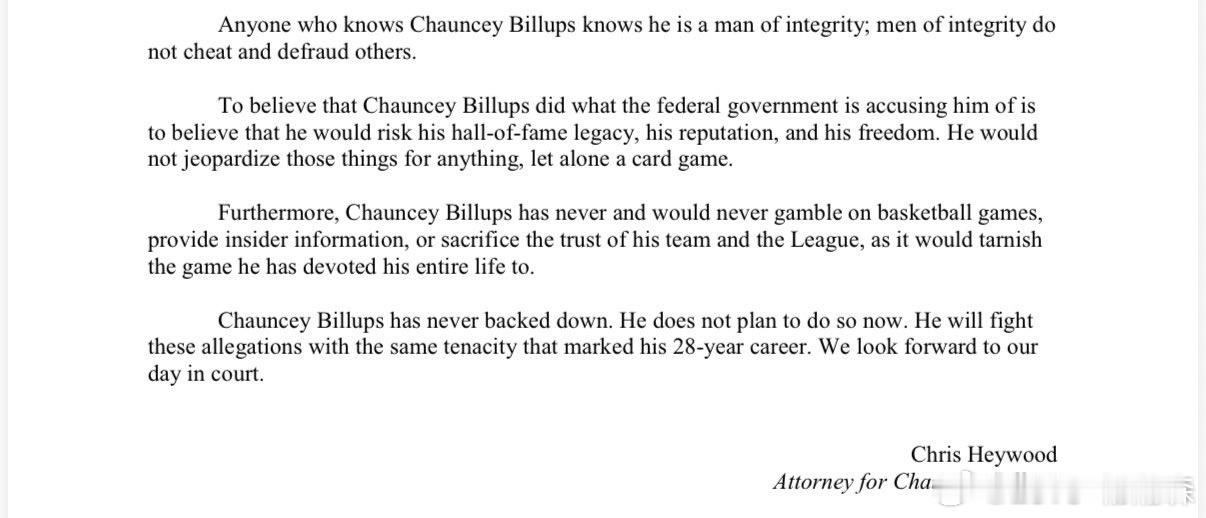 比卢普斯的律师向 ESPN 发表声明,明确表示比卢普斯不会参与赌博,将与FBI抗辩到底!比卢普斯律师声明其绝不会赌博
