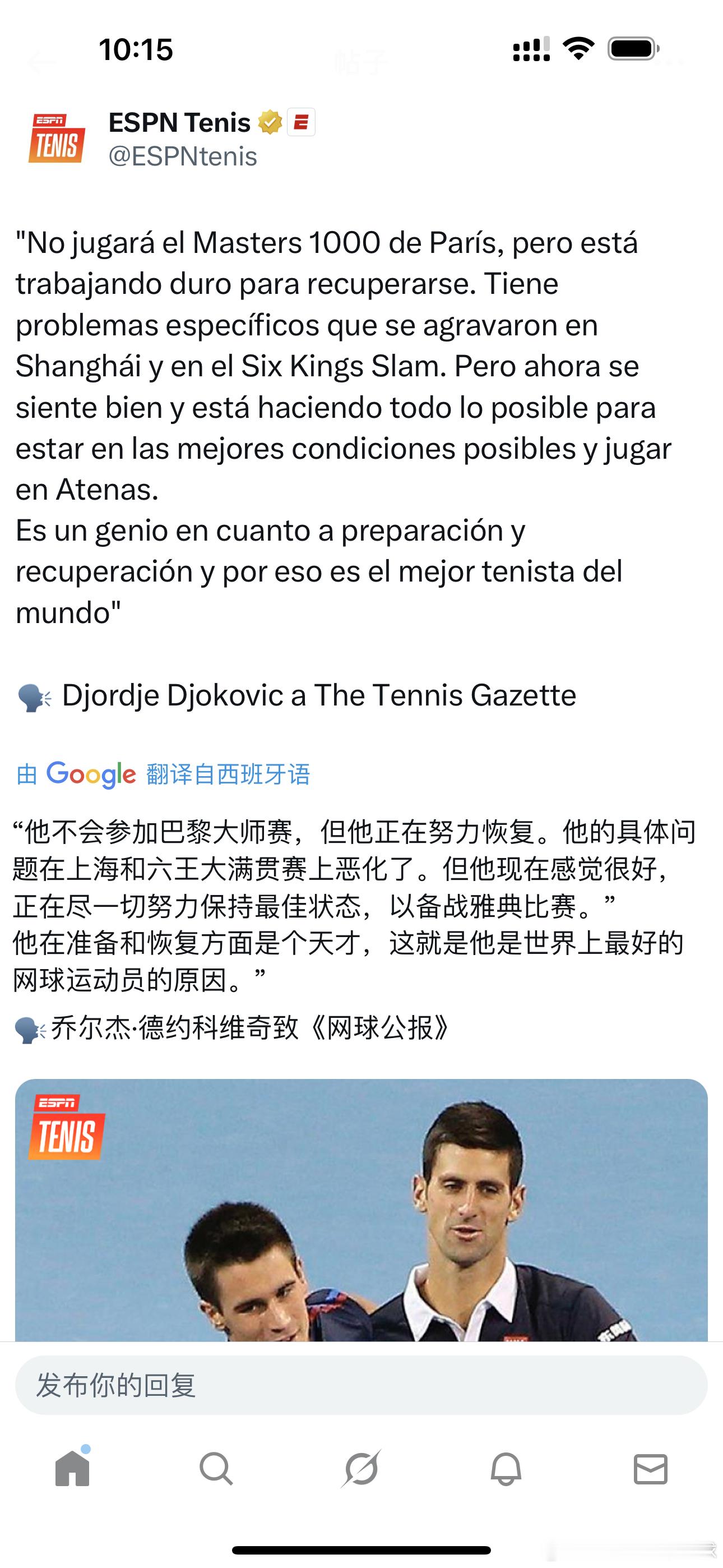 德约科维奇兄弟👬透露本尊情况“他不会参加巴黎大师赛,但他正在努力恢复。他的具体