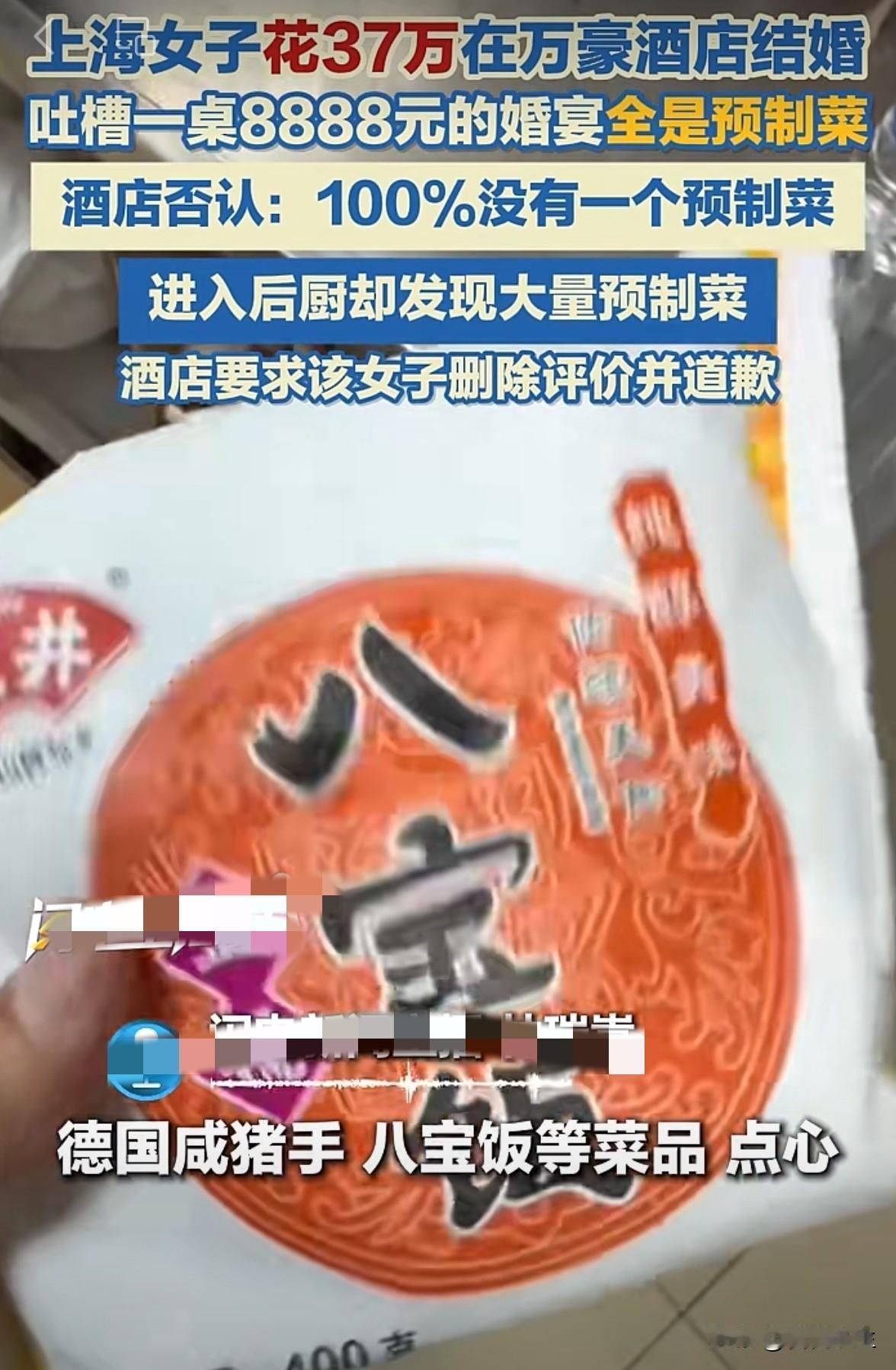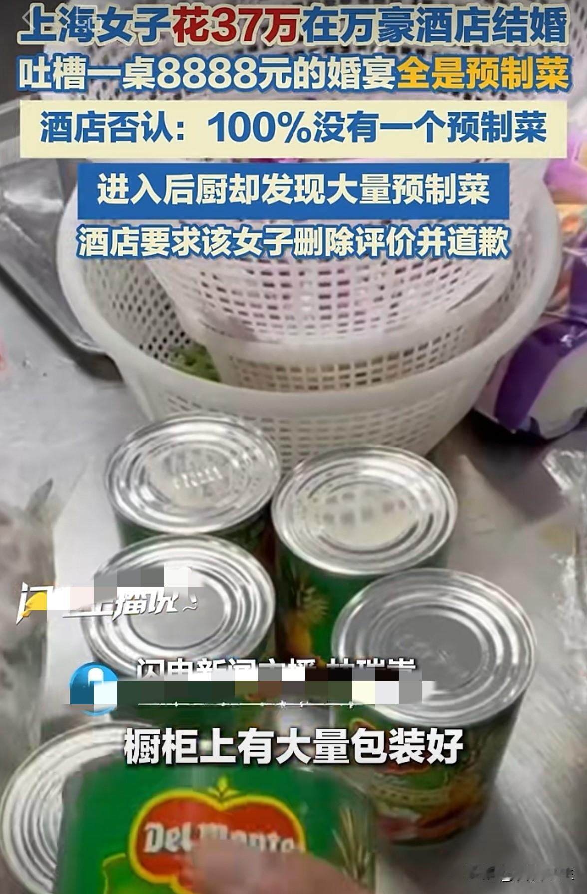 37万婚宴预制菜后续: 顾客后厨发现端倪,酒店反向顾客发律师函。 西贝预制菜风波过后,社会上掀起了抵制预制菜狂潮,每个人都想吃但新鲜的菜品,然而这一产业链已经形成已久,想要掐断这一产业链那是不可能的,但是顾客起码有知情权对吧? 网友表示:以后去酒店举办婚庆等大形餐饮,就必须有个自己人在厨房监督。如果酒店不让的就不要去了,花高价吃预制菜还不如回农村办。 还是我们农村坝坝宴好。至少新鲜,干净卫生。而且还全程监控操作流程。只不过环境要差一点。 也有网友说:酒店没问题,国家现在不是在打击传播负面情绪么,该新人向人民传播了预制菜的负面情绪,影响了国家预制菜战略,应该负负刑事责任 做“围席”对于使用“预制菜”可能会有,但也不一定。“围席”包括主菜、配菜、闲菜、汤点…如图所示,这消费者对所谓的“预制菜”有着不同的理解…有点过了。凡事都以事实定对错,不是吹毛求疵,谢谢。