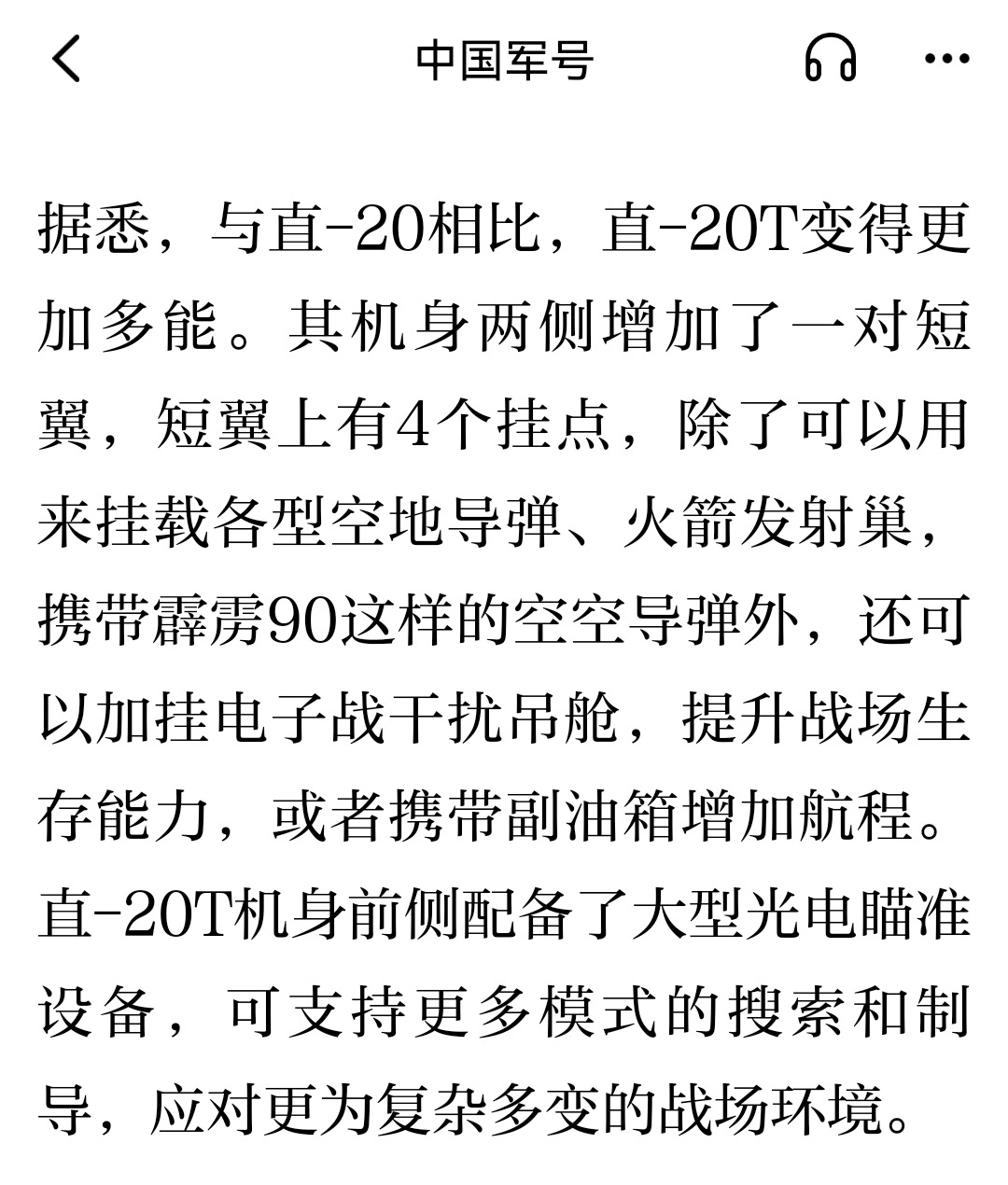 与直-20相比,直-20T机身两侧增加了一对短翼,短翼除了可以用来挂载各型空地导弹、火箭发射巢,携带霹雳90这样的空空导弹外,还可以加挂电子战干扰吊舱,提升战场生存能力,或者携带副油箱增加航程。直-20T机身前侧配备了大型光电瞄准设备,可支持更多模式的搜索和制导,应对更为复杂的战场环境。