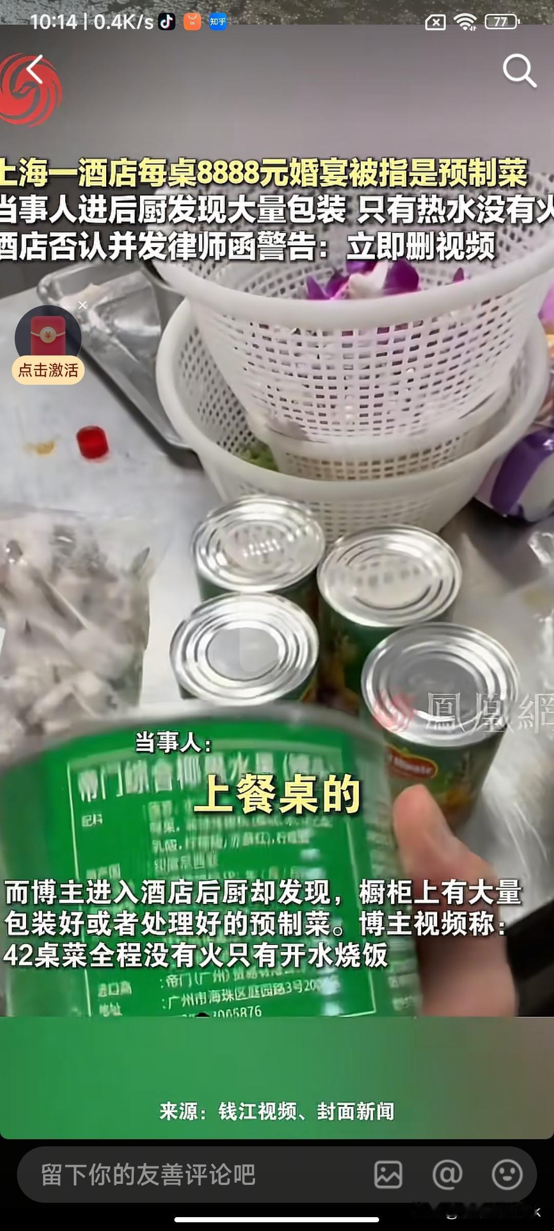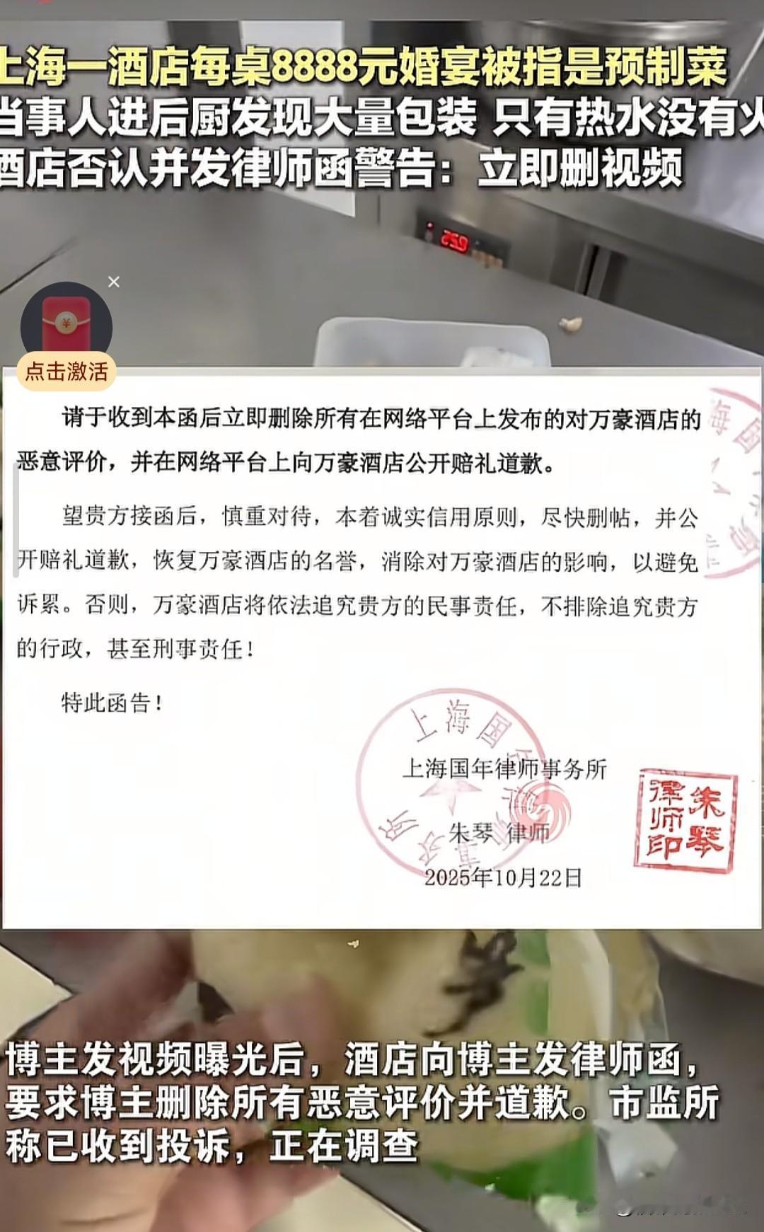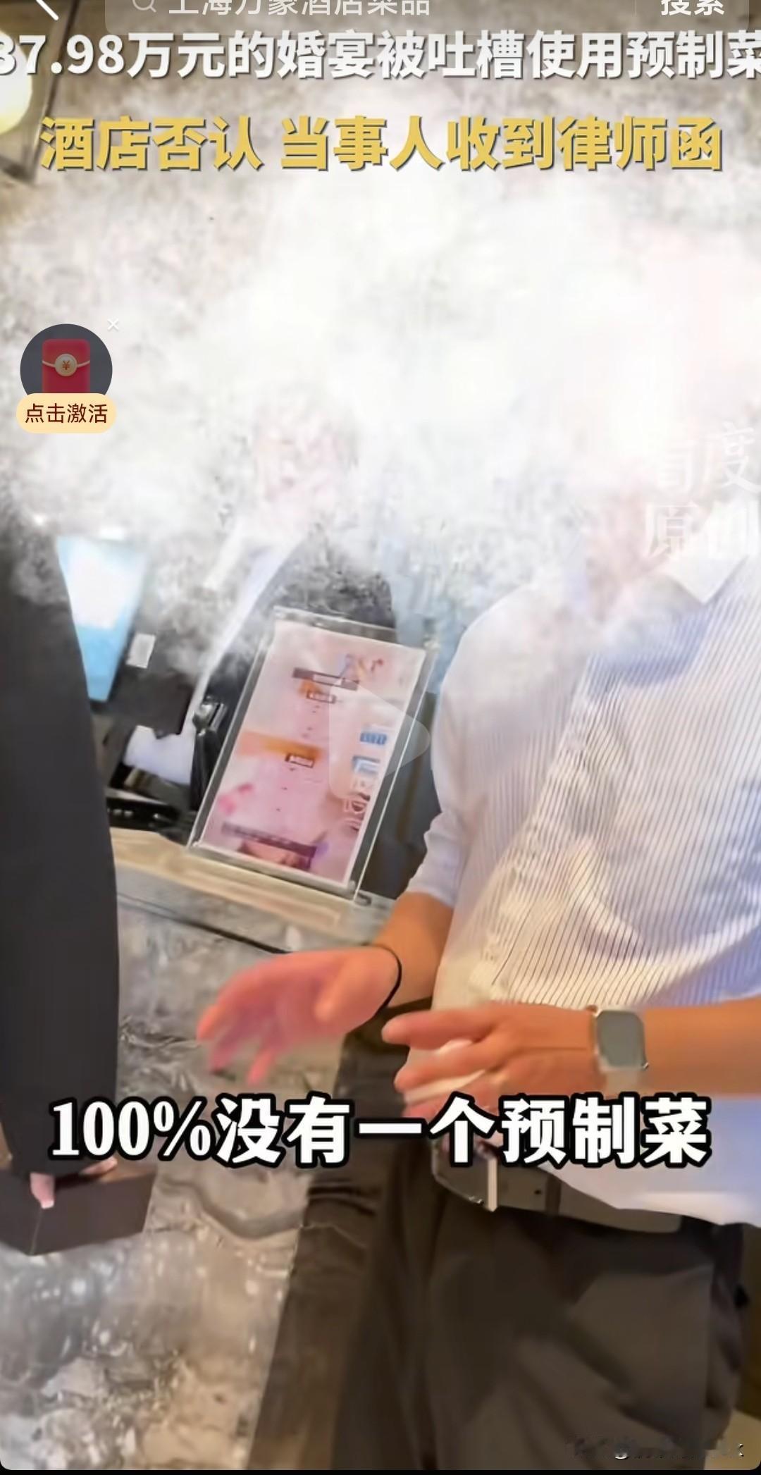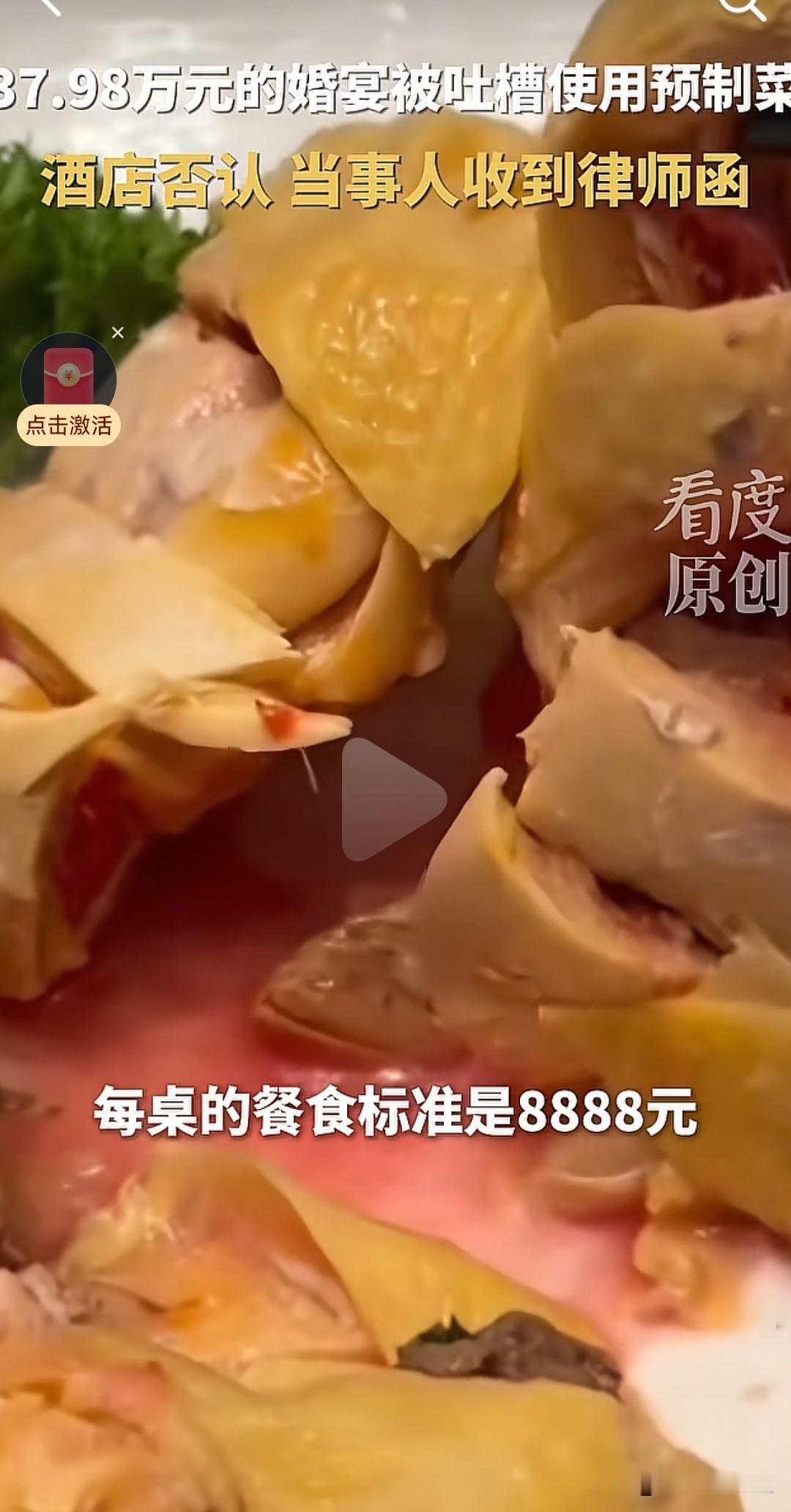第二个西贝,上海万豪酒店这次玩完了,8888元一桌的婚宴被吐槽是预制菜,被抓现行还态度强硬,市监局已介入调查。 近日,有博主称,自己以每桌8888元的价格,在上海万豪酒店包了43桌婚宴,总共花37.98万元,为了就是好好答谢宾客,招待好宾客,尽地主之谊。 不曾想被亲友吐槽味道不好,是预制菜,白切鸡块冷的还带血水,肉和皮分开,大明虾是冻虾,虾肉颜色不对,海鲜贝壳有空的等。 博主找到经理,经理信誓旦旦地说100%不是预制菜。 博主再三确认,有没有塑封的菜品,剪开后直接加热的,这样的菜有没有? 酒店方还是斩钉截铁地说,没有! 博主不相信,两口子跑到酒店后厨,不看不要紧,一看更生气。厨柜上有大量包装好或处理好的预制菜,其中就包括博主婚宴上的菜品。 是不是似曾相识?和西贝一个样。博主气不过将视频发到社交平台,得到大量网友关注。博主马上收到了酒店方发的律师函,“发布不实言论”要求删视频并公开道歉。 博主称“人生被万豪毁了”。近38万元吃不知何时做的剩菜,确实挺冤。有网友热讽酒店每桌狂赚8000元。 市监局已经介入,正在调查。 大家不是反对预制菜,而是反对以预制菜做虚假宣传冒充新鲜菜,反对预制菜卖新鲜现做菜价格,顾客花这么高价不就是为了图个新鲜可口的口味吗? 有的店家说,客多了忙不赢,只能有的用预制菜。 而我要说,多大能力办多大的事,顾客应有知情权,弄虚作假总有砸盘的时候。农村的大棚宴席几十桌不是做得怪好的? 这两例事件告诉我们,外出吃饭尽量去人气少的小店,找能看见明火锅灶烟火气的店,办宴席不必追求酒店档次,看看后厨锅灶炉火,一般的店有时性价比更高。 万豪五星级酒店和老品牌西贝翻车,说明这种情况不在少数,街边小店和农村流动棚席会越来越吃香,追奉档次的风气会刹车。