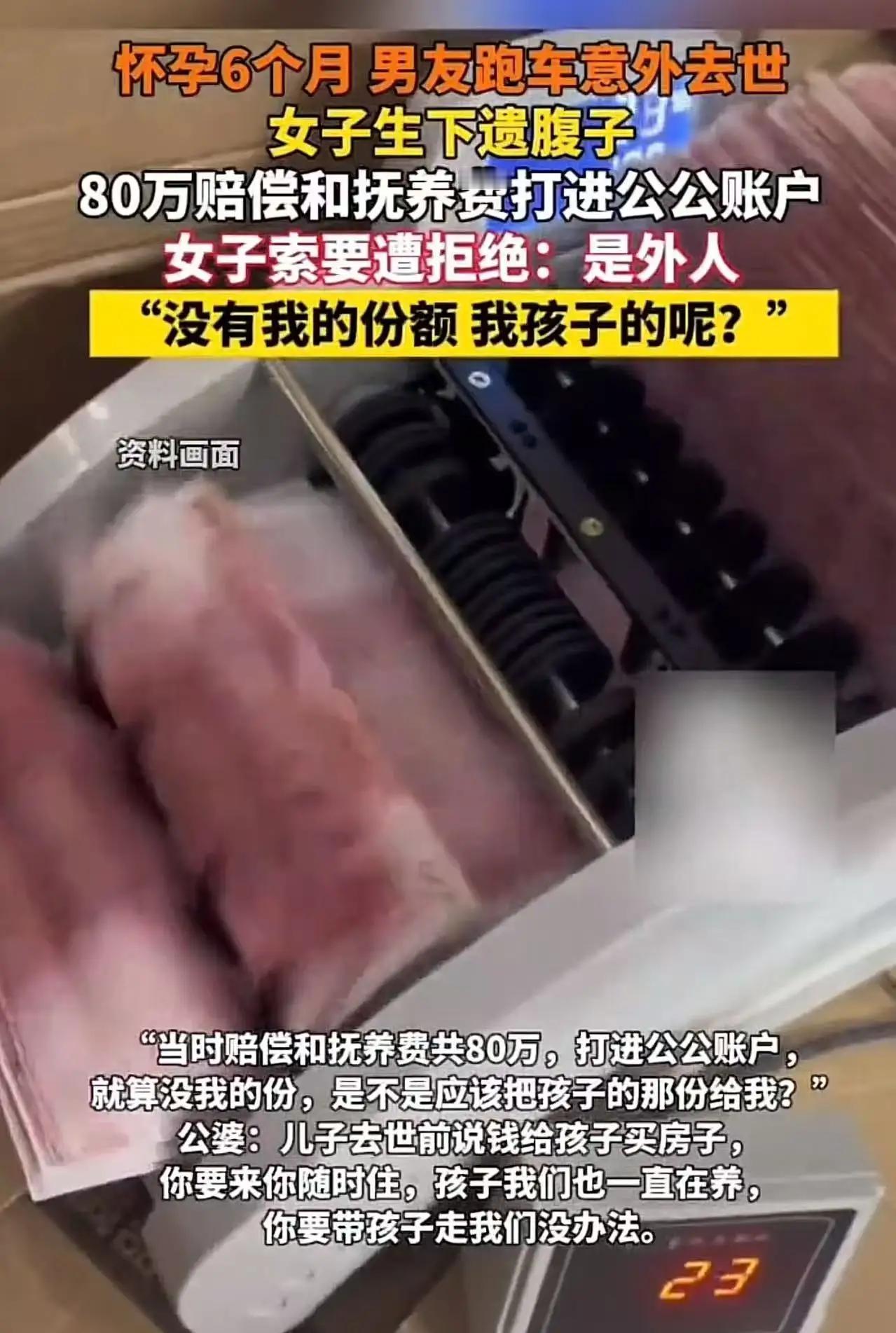 这起事件牵动人心,展现了家庭关系中的复杂与矛盾,也引发了社会对责任、权益和情感的深思。 事情的经过是:一名怀孕六个月的女子在男友因车祸意外去世后,顺利生下遗腹子。随后,法院判决赔偿金80万以及抚养费由相关方面支付。然而,令人震惊的是,这笔赔偿和抚养费全部被转入了公公的账户。女子随后向公公索要一部分赔偿款和抚养费,却被拒绝。公公理由是:“你是外人,钱给你跑了怎么办?”女子则反问:“没有我的份额,我的孩子呢?” 这段争执反映出家庭中利益、责任和情感的复杂交织。女子作为母亲,为了自己和孩子的未来,理应享有相应的权益,而公公的态度则让她感受到家庭关系中的冷漠与不公。 此事件提醒我们:在家庭财产分配和责任承担方面,应坚持公平、合理的原则,同时也要尊重每个家庭成员的合法权益。法律虽然明确维护受害者和儿童的权益,但家庭成员之间的沟通和理解同样重要。 此外,社会也应加强相关法律知识的普及,让每个人都了解自己的权益,以防在突发事件中受到不公对待。家庭和睦、责任共担,是维护家庭幸福和社会稳定的重要基石。 希望类似的矛盾能得到合理化解,让受害者和儿童都能得到应有的关爱和保障,也希望每个家庭都能在理解与尊重中共同面对人生的风风雨雨。家庭情感矛盾 婚姻悲剧 婚姻家庭新解释