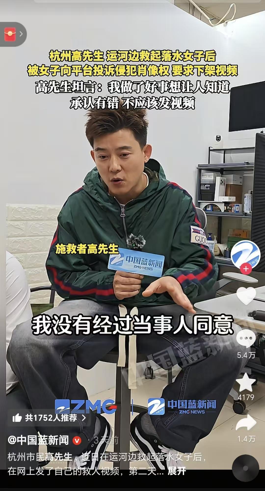 原本在网上发个视频记录生活,想让网友夸夸自己,没想到却遭到被救女子举报,以“侵犯肖像权”为由举报视频下架。 后来打了马赛克,视频才重新再次发布出来。 目前,救人者高先生在接受媒体采访时,已经向被救女子道歉。 这件事情,让人看得有点心堵。 近日,浙江杭州的高先生跳河救下了一名陌生女子,因为是第一次救人,高先生就将救人视频发到网上,想让网友夸夸他,没想到却遭被救女子的举报,理由是高先生侵犯了她的肖像权。 严格意义上来说,高先生未经被救女子允许,就将视频发布到网上,确实是侵犯了女子的肖像权,高先生虽然觉得有点委屈,但还是真诚向女子道了歉。 就像高先生说的那样,每个人都希望别人夸自己,这是一个很朴实的想法,我们大多数人也是这么想的,但是女子举报侵犯肖像权于法有据,但是,将心比心,确实让人心里有点不太舒服。 女子是因为什么原因而落水的,新闻上却没有报道出来,我们不得而知,但无非就是两种,要么轻生,要么不小心,如果是不小心落水的,小编觉得就算是真人出镜也没有什么。 如果是轻生呢,高先生不出手相救,后果呢?这名女子,也没有任何机会去举报高先生了,只能是家属行使这个权利了。 高先生确实值得夸,更值得被救女子的感恩,我觉得即使是觉得高先生做法有点不妥,也最好通过私信方式表明自己诉求,而不应向平台举报,女子这样的行为,会让高先生心里面不太舒服。 总之,高先生救人,是正能量的,就应该大力宣传这种见义勇为的行为,他值得我们所有人为他点赞。 对此,大家怎么看,欢迎留言评论,谢谢大家。