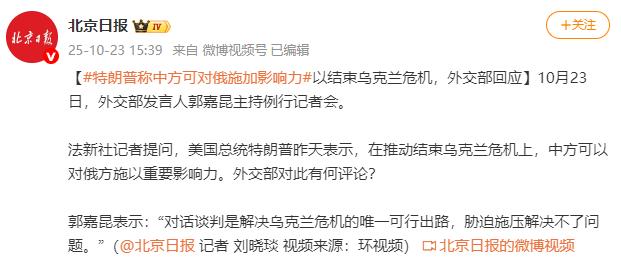 特朗普摊牌,他搞不定普京,但中国可以! 10月22日,美国总统特朗普在一场公开活动中被记者追问,什么时候才能解决持续已久的俄乌冲突,他则回答称:中方或许能在推动冲突结束这件事上,对俄罗斯总统普京产生“重大影响”。他还计划在月底的APEC峰会期间,和我们进行一次长时间的会晤。 明眼人一看就明白,特朗普这是想让中国出面给普京施压,把中国拉进这场地区冲突里来。 特朗普这番表态把中国推到了舆论聚光灯下,毕竟俄乌冲突打了这么久,早就成了国际社会最关心的大事之一。这种试图让中国介入他国内政的想法,显然没考虑中国的外交立场。 果不其然,就在特朗普表态的第二天,也就是10月23日,中国外交部在例行记者会上就对此作出了明确回应。发言人强调:对话谈判才是解决乌克兰危机唯一行得通的办法,靠胁迫施压根本解决不了任何问题。 这番回应既干脆又坚定,把中国在俄乌问题上的态度说得明明白白——我们既不偏帮任何一方,更不会干涉别国内政,始终站在和平解决的立场上。 其实特朗普会这么说,也不是没有原因。现在美国在俄乌冲突上似乎有点力不从心,国内对援乌的分歧越来越大,持续的投入让政府面临不小压力,所以才想找中国“帮忙”打破僵局。 但这种想法明显忽略了我们外交的根本原则——不干涉他国内政。 这是中国一直坚守的底线,不管是过去还是现在,在国际事务中我们始终主张用和平方式解决争端。再说了,俄乌冲突的根源太复杂了,里面牵扯着历史恩怨、民族问题还有地缘政治等一大堆事儿,这些都不是靠外部施压就能轻易抹平的,强行介入只会让局势更乱。 放眼国际社会,不管是普通民众还是各国政府,其实都盼着俄乌冲突能早点结束,让地区恢复和平稳定。毕竟冲突持续一天,就有更多人遭受苦难,对全球经济和能源市场也会造成影响。 但要实现这个目标,关键还得靠俄乌双方自己坐下来谈。只有双方平等对话,好好听听对方的合理诉求,才能找到一个大家都能接受的解决方案。美国想让中国施压俄罗斯的做法,不光不符合中国的外交立场,对冲突解决也没好处,外部势力瞎掺和只会让矛盾更难化解。 我外交部的回应不光亮明了我们的态度,也给冲突解决指了条明路——别搞对抗那一套,回到谈判桌前,只有对话才能从根儿上解决问题,这也是国际社会最希望看到的结果。