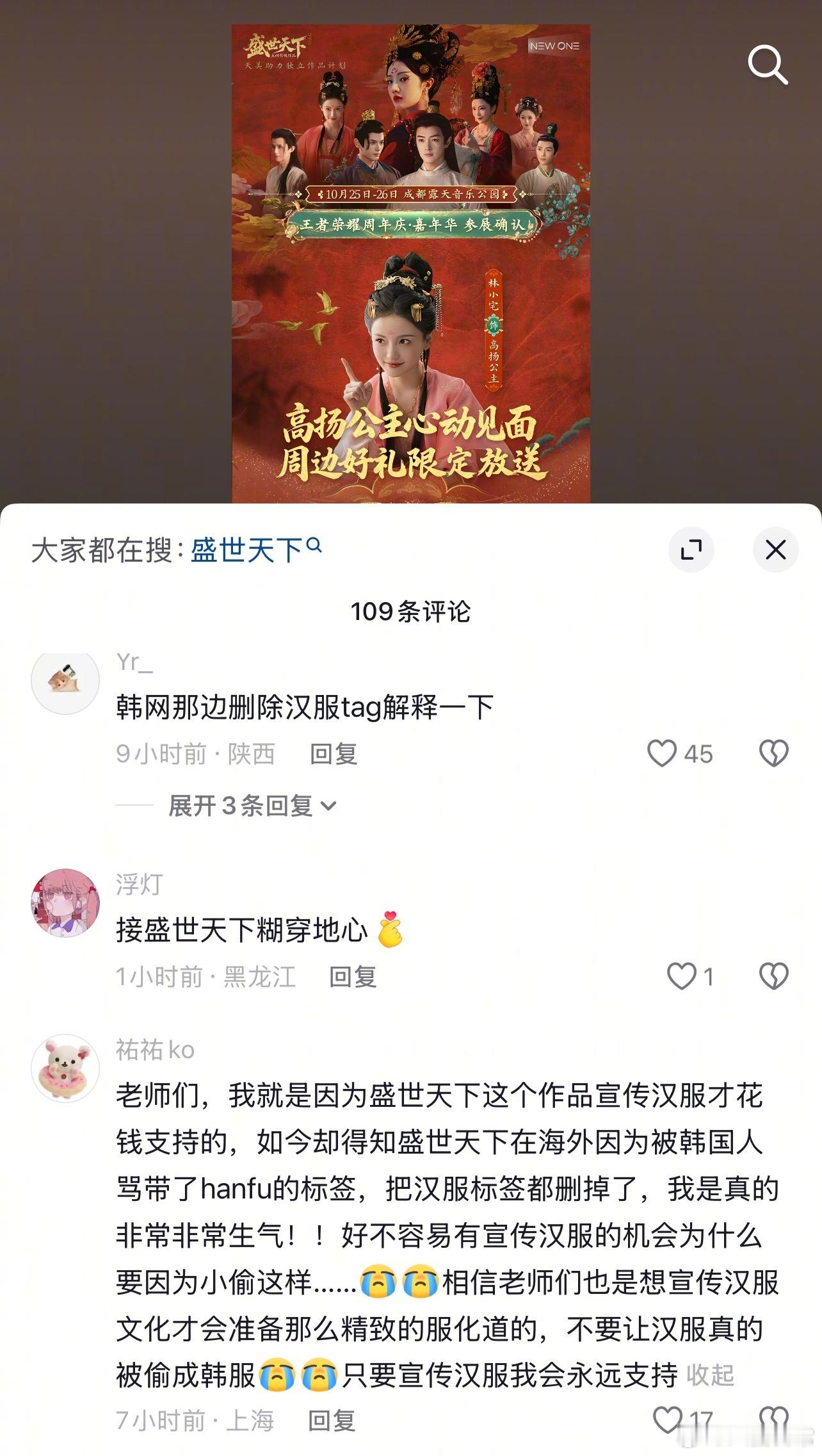 《盛世天下》官方在推特发帖带了汉服tag,被🇰🇷人骂偷韩服,随后官方把汉服tag删了