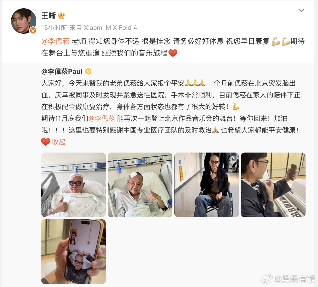 据李伟菘透露,一个月前李偲菘在北京突发脑出血,所幸被同事及时发现并紧急送医,手术非常顺利。目前,李偲菘在家人陪伴下正积极配合康复治疗,身体各方面状态已有很大好转。李伟菘还表达了对弟弟的期待,希望能在 11 月底与他一同登上北京作品音乐会的舞台,并特别感谢了中国专业医疗团队的及时救治。