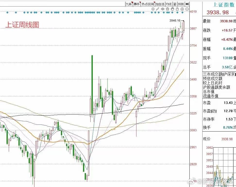第三,今天是星期五,从图二本周的周k线图来看,基本上已经定型。那么我们可以发现指数从3040点的最低点上涨到当前为止。周线级别还没有看到任何像样的调整,而这种周线级别几乎接近70度角的大角度上升,莎莎认为是需要一次像样的技术调整的。上一次“9.24行情”从低点到最高点涨了985个基点。而今天市场指数从3040点到目前为止已经上涨了906个基点。最新这一段行情的涨幅已经越来越接近“9.24行情”的高度了。这也意味着短线调整的可能性正在增加。