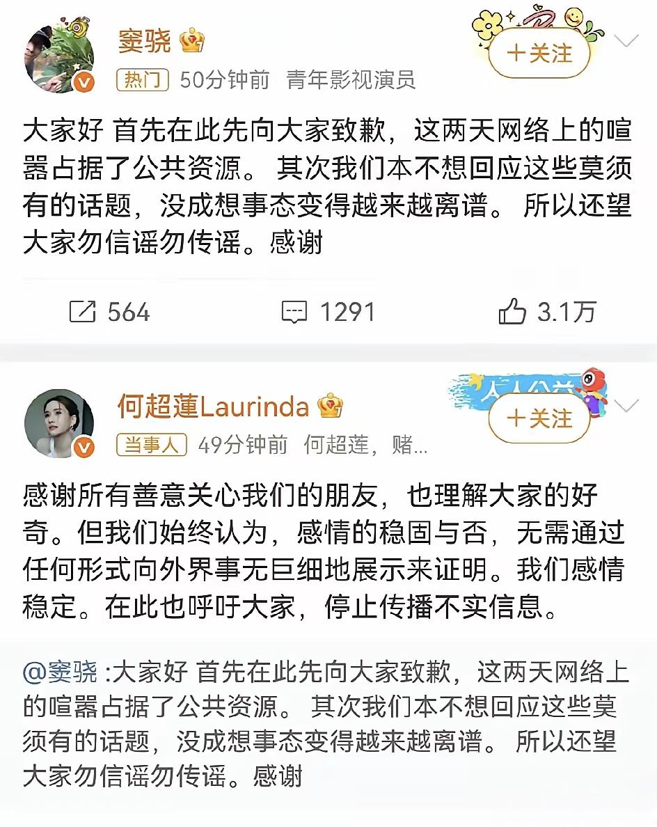 窦骁和何超莲夫妇出来辟谣了,说两个人的感情稳定,让大家别信谣传谣。与此同时,向太之前的爆料引发的讨论还没停,甚至有网友喊话向太出来道歉。 毕竟俗话说,宁拆十座庙,不毁一门亲。明星的感情生活本来是人家自己的事儿,却被各种猜测和谣言搅和得乌烟瘴气。窦骁和何超莲选择站出来澄清,这是对自己感情的负责,也是对关注他们的人的负责。感情这东西,稳定不稳定,从来不是靠向外界事无巨细展示来证明的,人家小两口自己心里清楚就行。 再看向太这边的爆料风波,不管出于什么原因,随意的爆料和猜测很容易对别人造成伤害。咱们作为吃瓜群众,还是得保持理性,别被谣言牵着鼻子走。感情是很纯粹的东西,别让那些乱七八糟的猜测和谣言把它给绑架了。 最后呢,希望大家都能多一点理性,少一点盲从,把目光放在更有意义的事情上,也祝愿窦骁和何超莲的感情能一直顺顺利利的。