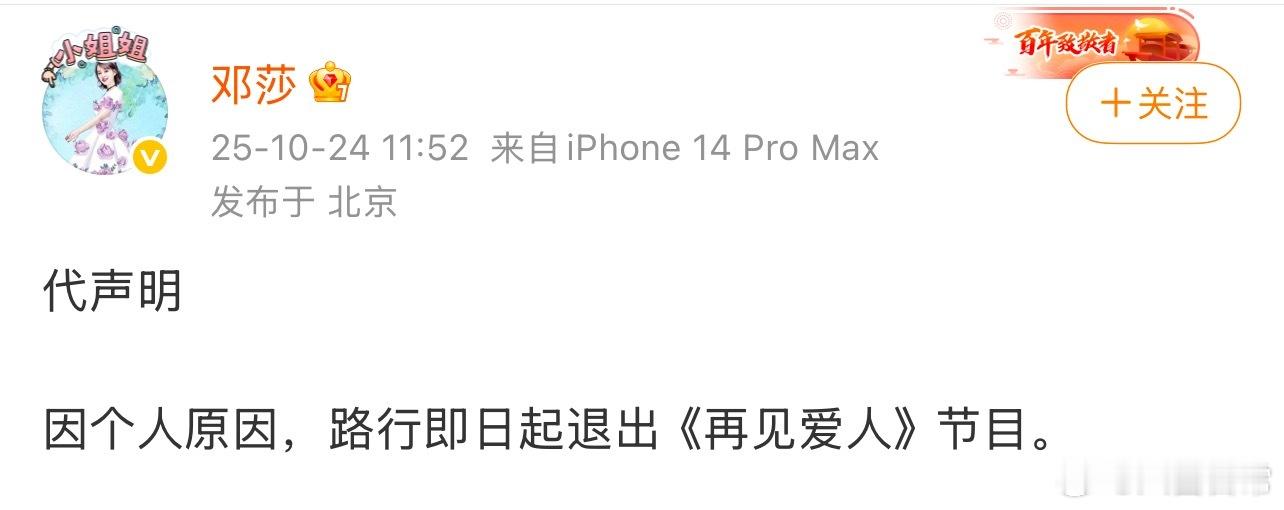 邓莎代替老公路行发声明:因个人原因,路行即日起退出《再见爱人》节目路行退出再见