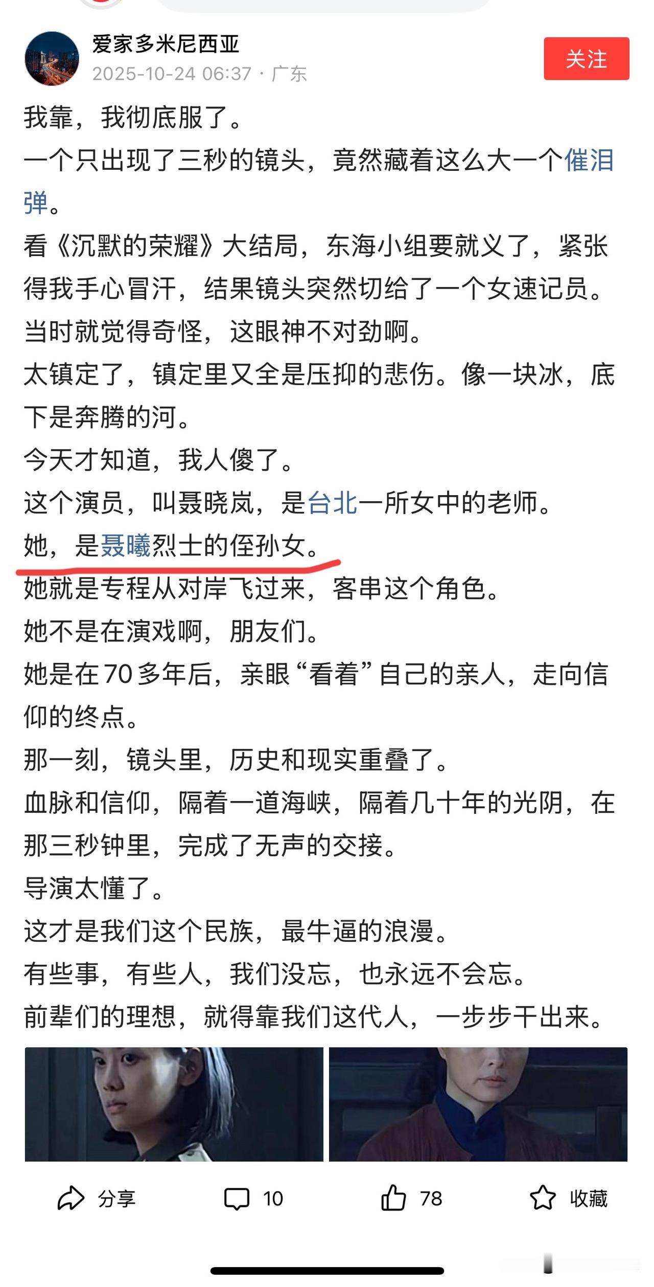 蹭流量没关系,造谣就不地道了 《沉默的荣耀》播出以来,受到大家的喜爱,同时也出现了很多蹭流量的无知博主,让人看完,很不舒服。 突然这几天出现了一个热搜,在吴石、聂曦、陈宝忠、朱枫就义前有一个女文员向英雄们投来无比敬仰的眼神。 就是这个女文员,被很多人传成了是聂曦的侄孙女,大陆导演为了向英雄致敬致敬,于是就请这个所谓的英雄的侄孙女来客串了这个角色。还给人家起了一个名字叫聂晓岚,于是这个聂晓岚就放下了教师工作,乘坐飞机来这边出演了一个几秒钟的镜头。 大家崇敬英雄的心情可以理解,但弄出这种无中生有的事就有些不厚道了,如果是别有用心的人故意捏造的假新闻,就更加令人不能容忍。 为了查询真伪,本人将这部电视剧的开头及结尾的字幕仔细看了几遍,从头至尾也没有看到有“聂晓岚”这三个字。即便用百度和豆包、以及DeepSeek也没查到聂晓岚任何信息。 ——————