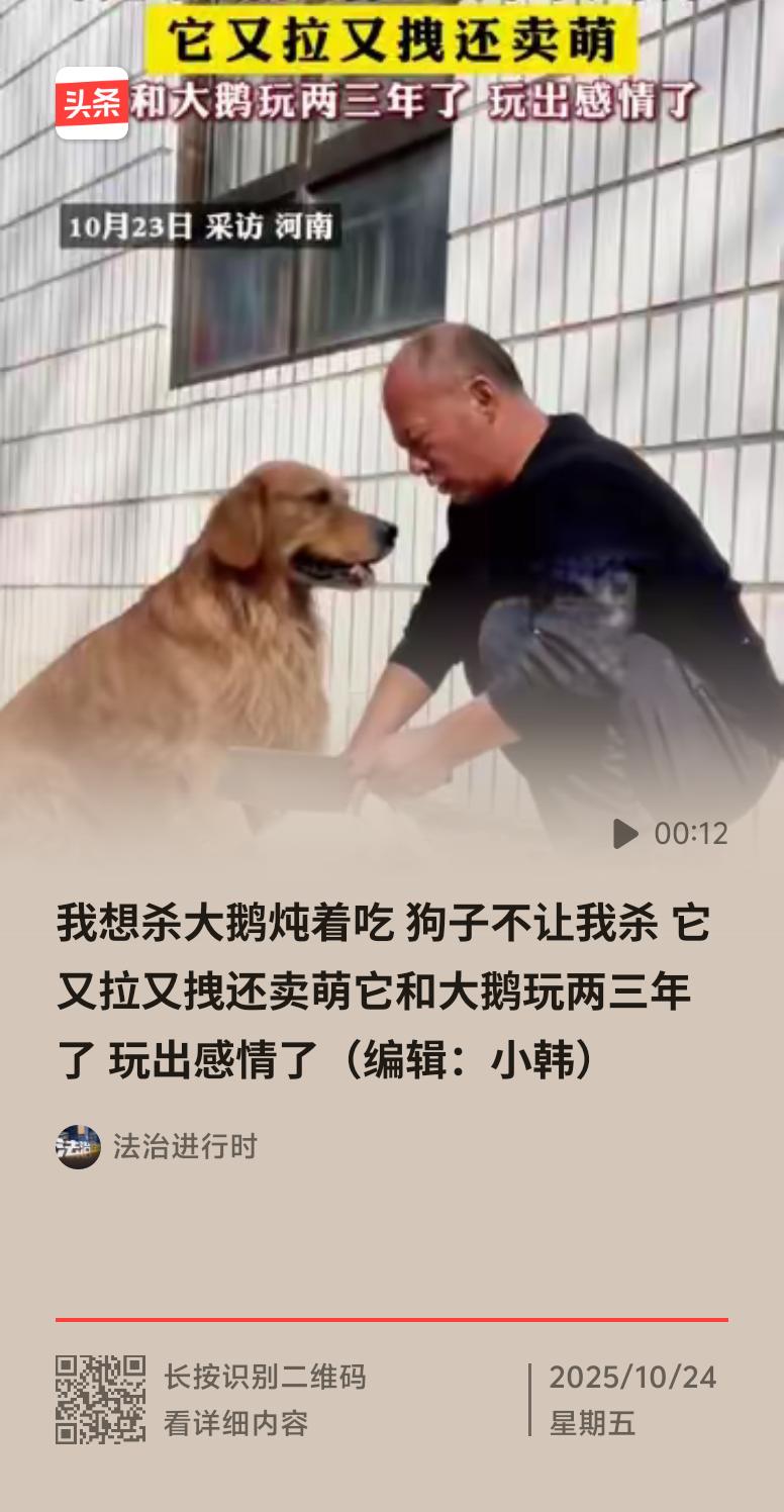 河南这事儿太逗了!主人想杀大鹅炖着吃,自家狗子直接化身“护鹅使者”。又是拉又是拽,还卖萌求情。原来狗子和大鹅一起生活两三年,感情那叫一个深。主人被感动,大鹅成功“保命”。 网友在评论区的调侃更绝,什么“左牵黄右擎苍”文化梗都来了,还有出“反间计”的,建议杀狗看鹅反应,没反应再杀鹅给狗看。甚至有人猜测狗把鹅当对象,狗子内心OS“都是一家人,相煎何太急”。动物们的感情和网友的脑洞,都太有意思了! 大只鹅