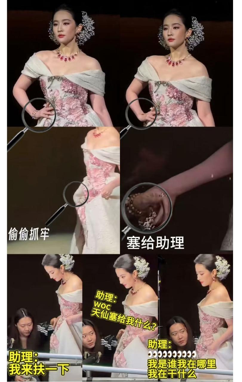 刘亦菲红毯走到一半,手上的宝格丽手链竟然开了!镜头还拍着呢,该怎么办?这临场应变能力也是绝了! 只见刘亦菲不经意的用手勾住松开的手链,利用换景的功夫,迅速将手链递给场下的工作人员。工作人员都懵了:这是递给我啥?啊?竟然是宝格丽手链! 不愧是初代女明星,十几岁就能演出白秀珠、小龙女、王语嫣等经典角色,这临场应变能力和面对镜头的专业素养,让她压轴红毯就对了! 刘亦菲 刘亦菲手链掉落