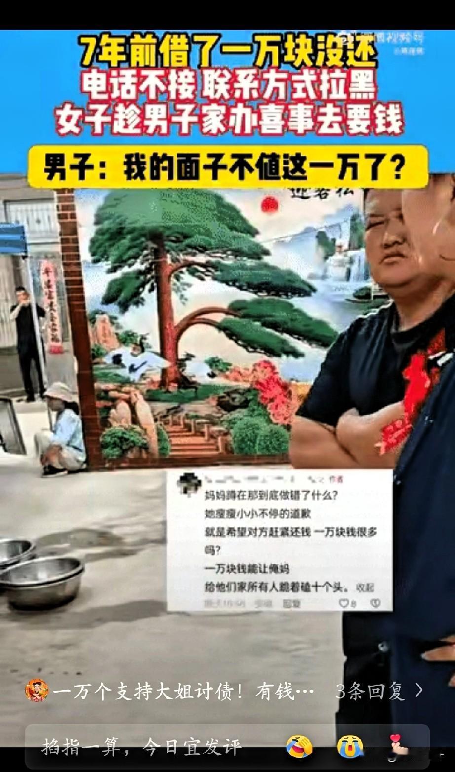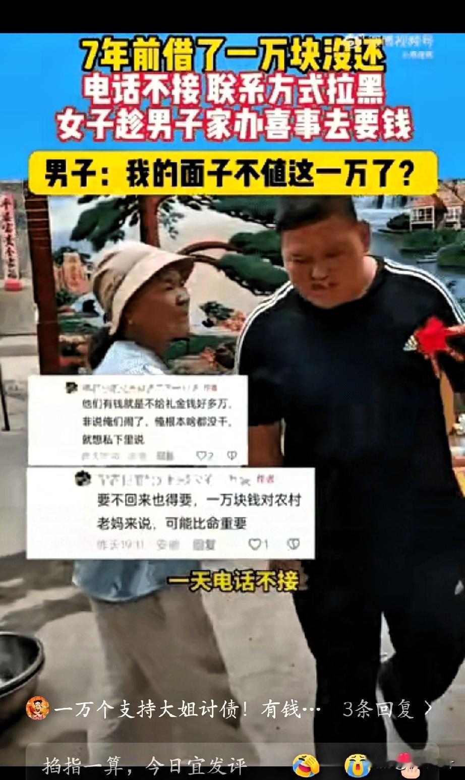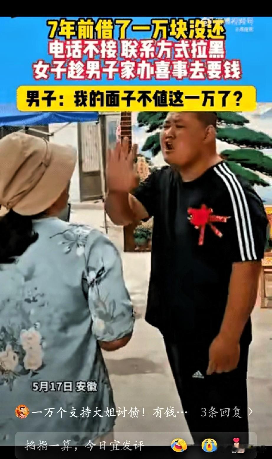 丢脸丢到家了!安徽一男子给儿子办婚礼,现场红绸挂着、鞭炮响着,亲戚朋友围着道喜,正热闹得不行,突然冲进来个大姐,堵在门口就喊“还钱”,瞬间把喜庆劲儿全冲没了! 谁能想到,这场尴尬闹剧,全是男子自己埋下的祸根。 七年前,他做生意赔得底朝天,走投无路时找到这位大姐,拉着人说尽难处求帮忙。大姐心善,没犹豫就借了1万,想着帮他渡过难关。 可等男子后来生意回暖、日子好起来,却把这笔债抛到了脑后。大姐找过他好几次,他要么哭穷说“没钱”,要么找借口拖延,到最后甚至不接电话、不见面,明摆着要赖账。 大姐憋了七年,实在没办法,才打听着儿子的婚期找上门。她早有准备,当场掏出当年的转账记录和借条,一条一条念出来,把男子的谎话全戳破了。 现场亲戚们瞬间炸开了锅,交头接耳议论不停,好好的婚礼变成“大型丢人现场”,男子脸涨得通红,站在那儿一句话都说不出来,连带着媳妇、父母都抬不起头。 有人说大姐太绝情,不该在婚礼上拆台。可换个角度想:要是大姐当初不心软,男子未必能熬过难关; 要是她真想逼人,早走法律程序了,哪会等七年?借钱是情分,还钱是本分,男子为了1万把“感恩”踩在脚下,被堵门纯属自找的。 倒是想问问大家,要是你借出去的钱七年要不回来,对方还故意躲着你,你会像这位大姐一样,在对方重要场合要债吗?