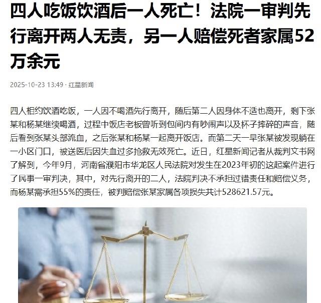 河南濮阳,四人聚餐喝酒,俩人先后离开,剩下张某和杨某,包间传出吵闹和杯子的碎声,饭店老板发现张某后脑 流 血,两人醉酒后离开。次日张某被发现躺小区门口,经抢救无效 死 亡。杨某称张某应自担责任,但审理认为同饮者有义务,杨某未尽照顾等义务,判其担55%责任赔52万余元。 在这个看似普通的聚餐事件背后,隐藏着一段令人扼腕的社会现实和人性考验。或许我们都曾在朋友的聚会中,喝得酩酊大醉,享受那一刻的欢愉,却忽略了身边那些微妙的责任与关怀。这个案件,让我们不得不反思:在我们追求自由与放纵的同时,是否也应该承担起应有的责任? 事情发生在河南濮阳,一场看似平常的四人聚餐,竟演变成一场生命的悲剧。两人先后离开,留下的只是包间里的吵闹声和碎裂的杯子声,仿佛一场无声的警钟。饭店老板发现张某后脑流血,紧急送医,却最终无力回天。次日,张某倒在小区门口,永远离开了这个世界。如此突如其来的死亡,让人心碎,也让人深思:在醉酒的背后,我们究竟失去了什么? 杨某在事后声称,张某应自担责任,然而法院的判决却揭示了一个更深层次的社会问题——同饮者的责任。法律明确指出,作为同饮者,杨某未尽到应有的照顾义务,最终被判担55%的责任,赔偿52万余元。这不仅仅是一份赔偿,更是一份对“责任”的提醒:在朋友、在亲密关系中,关心和照顾绝不是多余的,而是应尽的义务。 这起案件的背后,是酒精带来的迷失与责任的缺失。醉酒本身并非罪过,但当我们放纵自己时,是否也在无形中放开了对他人的关心?当朋友倒地、受伤时,难道只是一句“他自己负责”就能了事?我们每个人都可能成为那个“杨某”,也可能成为那个“张某”。而生命的脆弱,让我们不得不正视:在欢聚一堂的背后,是不是还藏着我们对责任的逃避? 这个故事,让我忍不住想问:你是否也曾在某个瞬间,忽略了身边人的安危?你是否也曾在醉意中,放弃了应有的关怀?或许,只有当我们真正意识到“责任”的重量,才能在下一次的聚会中,少一些疏忽,多一些温暖。毕竟,生命只有一次,责任却可以传递一生。 这起案件,或许会让你我都感受到一份沉甸甸的责任感。别让欢聚变成遗憾,让我们在享受人生的同时,也学会守护彼此的安全。因为,真正的友情,不是喝酒时的狂欢,而是在关键时刻的陪伴与担当。聚餐醉酒 河南喝酒事件 聚餐后吐酒