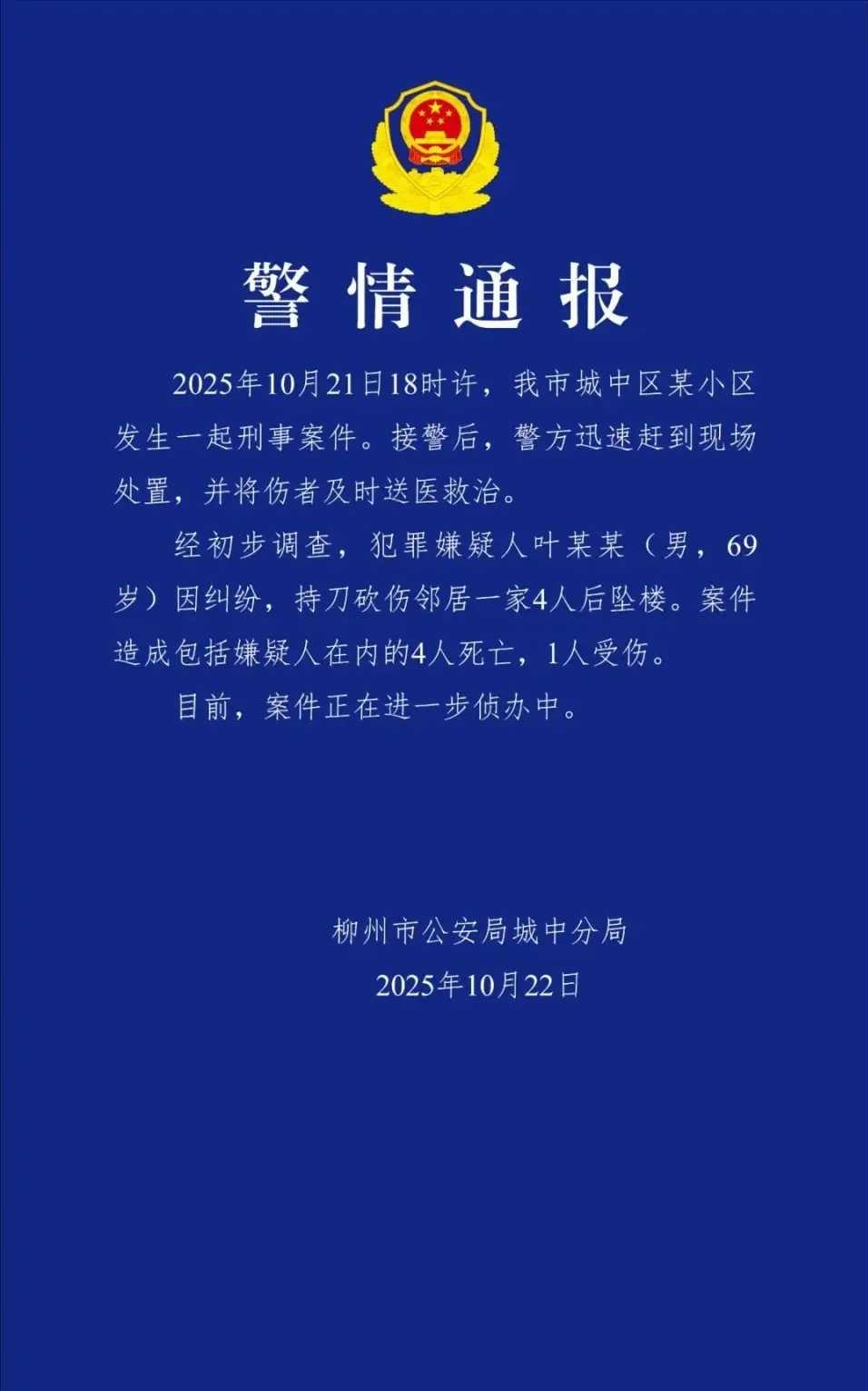 柳州血案4死1伤:69岁独居老人的噪音战争,压垮他的最后一句话 2025年10月21日18时,广西柳州怡鑫园小区的晚饭时间被凄厉的呼救击碎。69岁的叶某某持刀闯入三楼邻居家中,一番砍杀后纵身坠楼,最终造成包括他在内的4人死亡,女主人重伤昏迷ICU——这场悲剧的导火索,是持续两年的邻里噪音纠纷 。 两年煎熬:细碎噪音成“钝刀割肉” “楼板像没存在过,孩子跑跳声、半夜剁骨声天天穿透下来。”小区居民的讲述,拼凑出叶某某的绝望日常。这位独居12年的老人老伴早逝,子女鲜少探望,2023年确诊的轻度阿尔茨海默病,让他对安静有了偏执的需求。而楼上34岁男主人一家四口的生活声响,成了他无法逃离的折磨。更让他崩溃的是,楼上偶尔还会将垃圾袋堆在他门口。 这场矛盾并非突发。从2024年起,叶某某的投诉从未间断,物业先后调解5次,却都陷入“当面说好,回头照旧”的循环。有知情人透露,双方曾多次爆发激烈冲突,楼上女主人曾持菜刀拍门辱骂,威胁“开门就砍死你”,警方也曾多次上门处置却收效甚微。 致命敷衍:“尽量沟通”成最后稻草 案发前一小时,叶某某还气冲冲地拍着物业办公室的桌子控诉:“剁骨头声快把墙震裂了!”但他得到的只有“尽量沟通”的敷衍回应。没人料到,这句冷漠答复成了压垮他的最后一根稻草。 更令人唏嘘的是,本有机会阻止悲剧的预警被完全忽视。叶某某6年前曾因琐事持刀伤人被拘留,警方当时收缴过其刀具,但此后社区既未上门走访,也未提供心理疏导,任由孤僻老人的怨气不断淤积。 破碎的两面:没有“坏人”的悲剧 这场血案中,两个家庭都走向了毁灭。受害家庭在小区口碑极好:60多岁的老婆婆常给邻居送青菜,夫妻待人客气,2岁的小孙子见人就甜甜问好。谁也没想过,这样和善的一家人会遭遇灭顶之灾,最终老婆婆、男主人与幼童不幸殒命。 而叶某某的人生同样悲凉。独居的孤独、病痛的折磨,让他将日常噪音解读为“针对”,最终在维权无门后走向极端。“他不是一开始就想杀人,是怨气攒得太满了。”一位熟悉叶某某的邻居叹息道。 全网共鸣:现代邻里的“维权困境” 事件迅速引发全网十万条评论共鸣,无数人倾诉相似遭遇:“我家楼上半夜弹钢琴,我住了一周酒店不敢吵架”“楼道旧鞋柜堆两年,只能心里暗骂”。律师指出,噪音维权需取证、记录、投诉、诉讼多步走,仅取证就需连续7天记录日志并搭配分贝视频,多数人难以坚持。而物业“和稀泥”、社区不作为,让小矛盾彻底失去化解窗口。 一声警钟:邻里相处的“容忍底线” “送排骨提醒凌晨剁肉的邻居,最后收到道歉和饺子。”知乎上的暖心案例,与柳州血案形成刺眼对比。律师表示,若楼上能铺垫隔音垫、控制活动时间,若叶某某能得到心理疏导,若物业调解有约束力,悲剧本可避免。 如今,4条鲜活生命的逝去已成遗憾,但留下的警示振聋发聩。当公寓楼的物理距离近在咫尺,隔音差的客观难题或许难以根治,但体谅之心与有效调解不该缺位。毕竟邻里一场,一杯茶的沟通、一次及时的介入,或许就能挡住一场血雨腥风。 好好活着,本应是邻里间最朴素的期许。